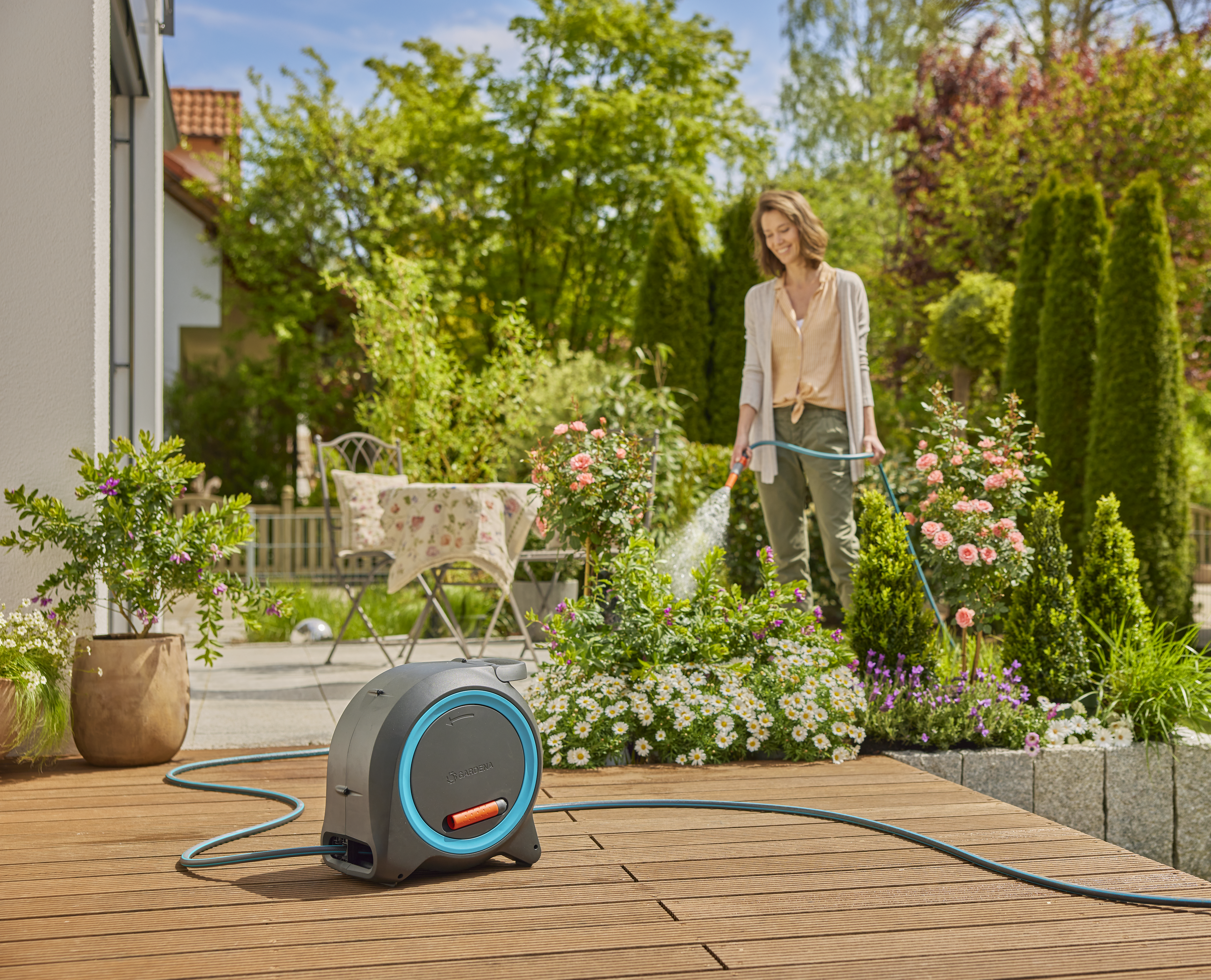- Easy and comfortable to use, with integrated automatic hose guide for even roll-up without kinking or knoting