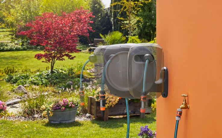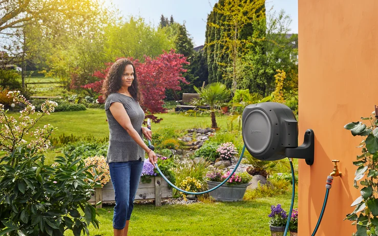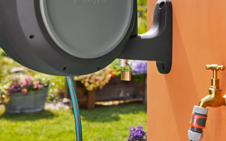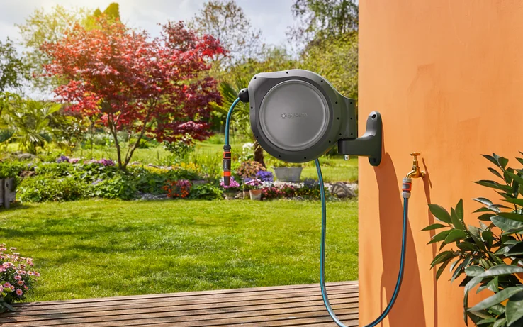 The set includes a 15-metre-long premium quality 13mm hose, GARDENA Fittings (Tap Nut Adaptor, Hose Connector and Water Stop Hose Connector), a 1.5 metre hose connection to reach tap, an easy-to-install bracket (including template) and a GARDENA Adjustable Spray Nozzle. Its 180° wall-mounted bracket provides flexible use and better control in many different directions.