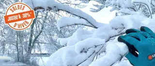 Une main gantée touchant des branches enneigées avec une superposition d’annonce de soldes d’hiver.