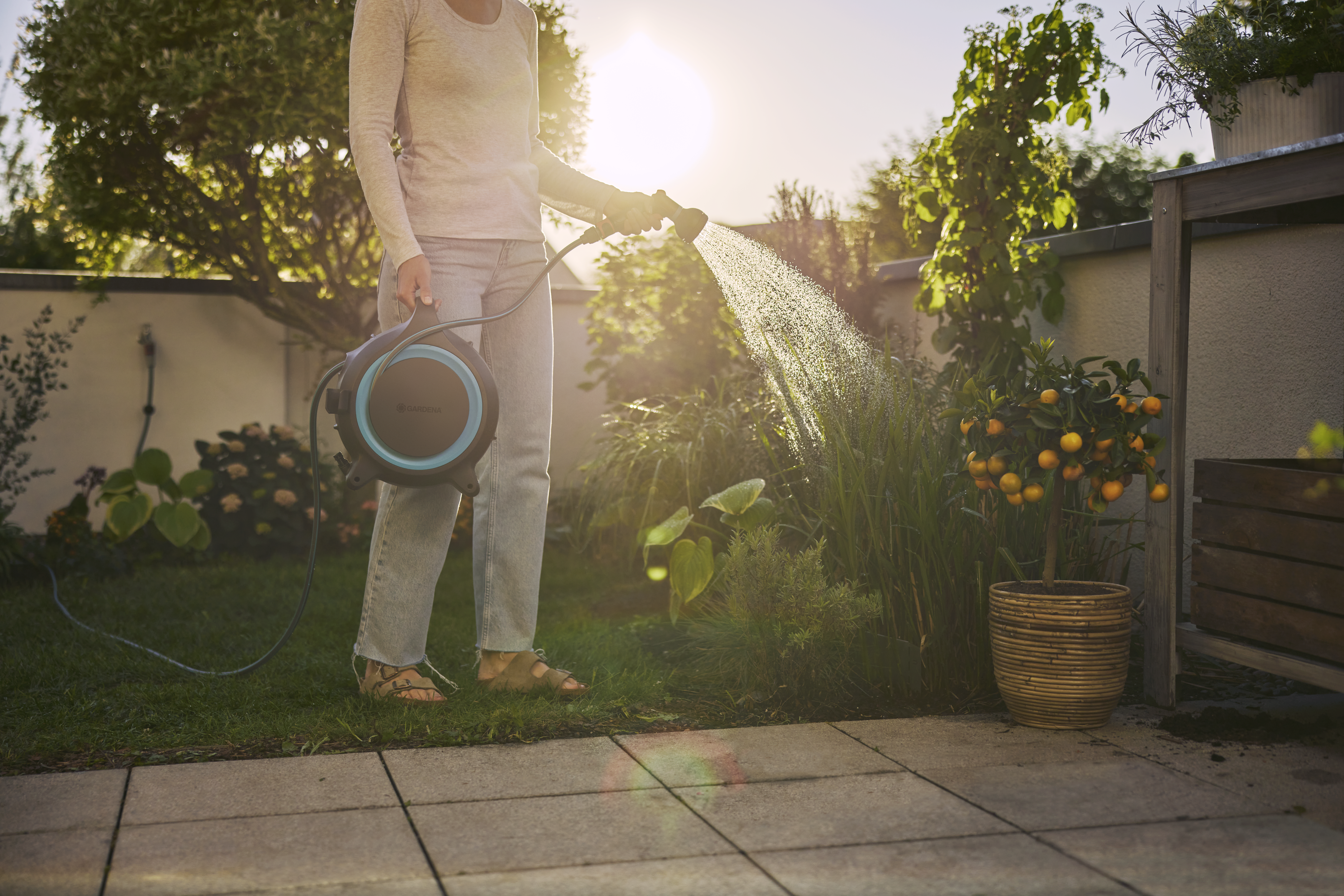 Petit et compact, le dévidoir de tuyau portable MoveMatic est conçu pour les tâches d’arrosage rapproché. La poignée intégrée permet de transporter facilement le boîtier du tuyau d’arrosage dans tous les coins d’un balcon, d’une terrasse ou d’un patio, tandis que la conception légère de 2,2 kg réduit la fatigue et simplifie l’arrosage en déplacement.