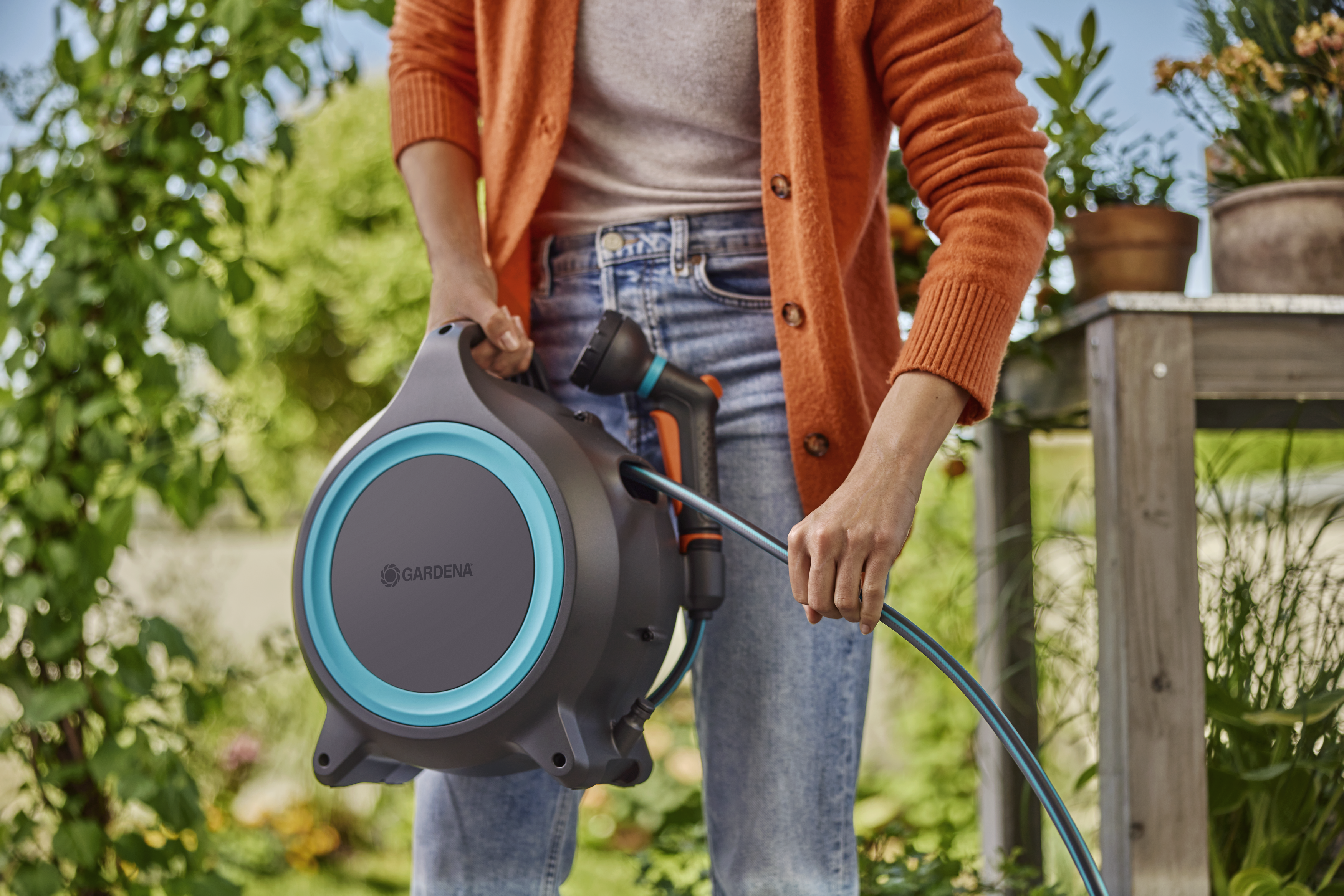 Le dévidoir portable MoveMatic de GARDENA est petit, compact et pratique. Doté d’un enroulement automatique du tuyau, d’un tuyau de raccordement de 12,5 m et d’un tuyau d’alimentation de 1,5 m, il convient aux balcons, aux terrasses et aux déplacements.
