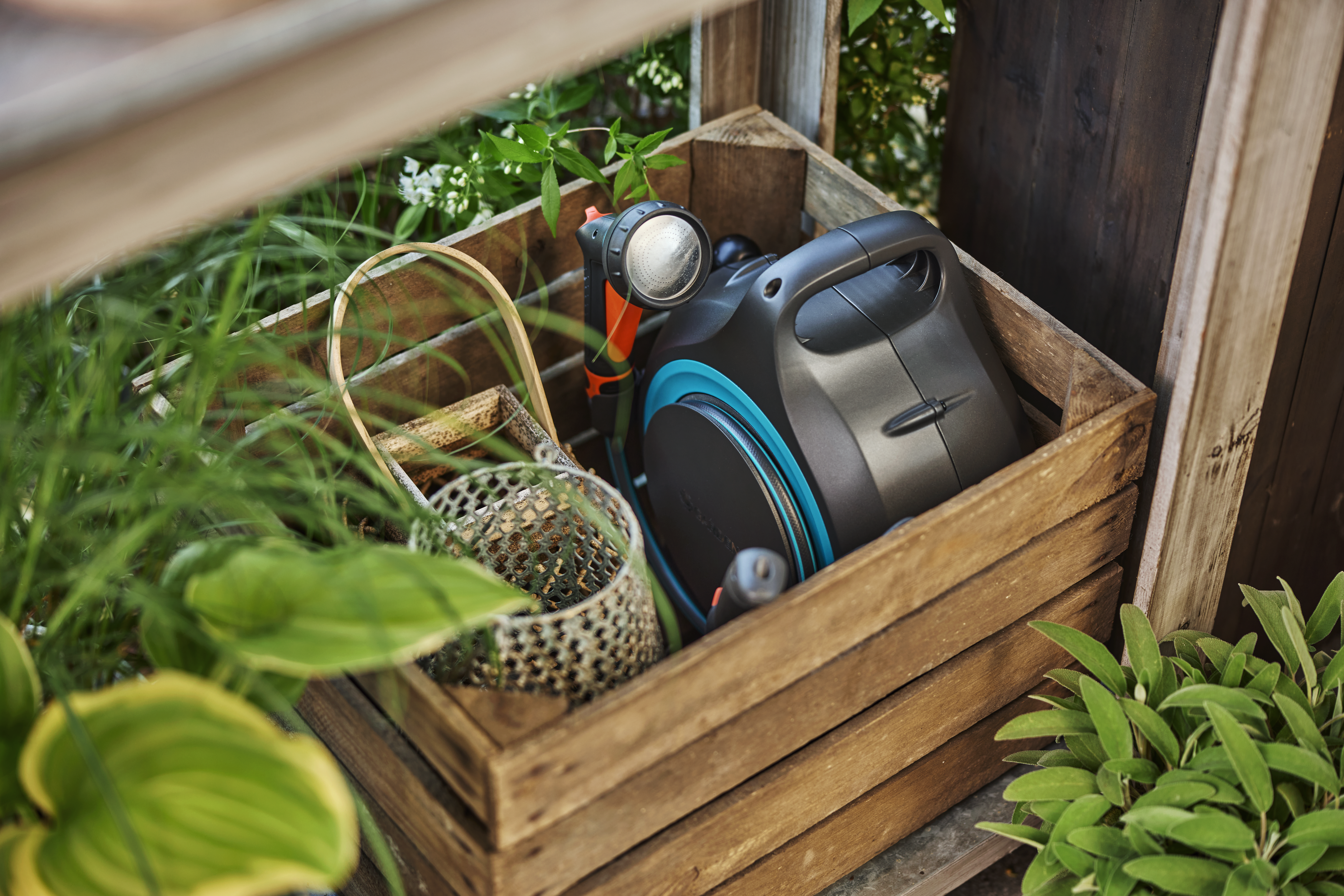 Petit, compact et pratique, le dévidoir portable MoveMatic avec enroulement automatique du tuyau convient aux balcons, terrasses et aux déplacements.