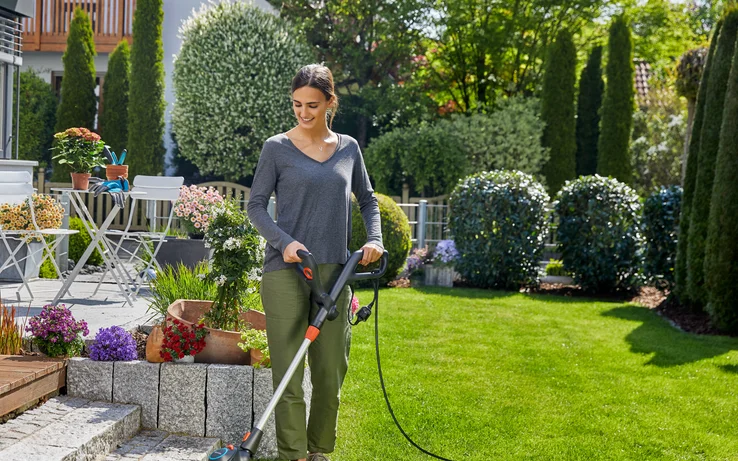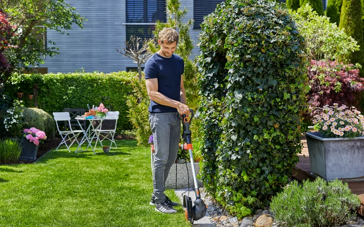 Voordat u begint, kunt u de Turbotrimmer eenvoudig aanpassen aan uw behoeften. Het handvat en de telescopische steel zijn verstelbaar zodat u een comfortabele houding kunt behouden tijdens het werken in uw tuin. Bovendien is de werkhoek van de trimmerkop verstelbaar. Dit is vooral handig wanneer u rond obstakels zoals een tafel snoeit. Bekijk ook eens de kantelfunctie van de kop waardoor de trimmer verandert in een graskantsnijder: op deze manier kunt u moeiteloos de randjes langs tuinpad of omheining netjes houden. En maakt u zich geen zorgen, uw planten worden door de verwijderbare plantbeschermbeugel beschermd tijdens het trimmen.