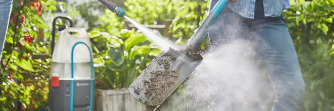 Жена почиства мръсен стол с водоструйка Gardena