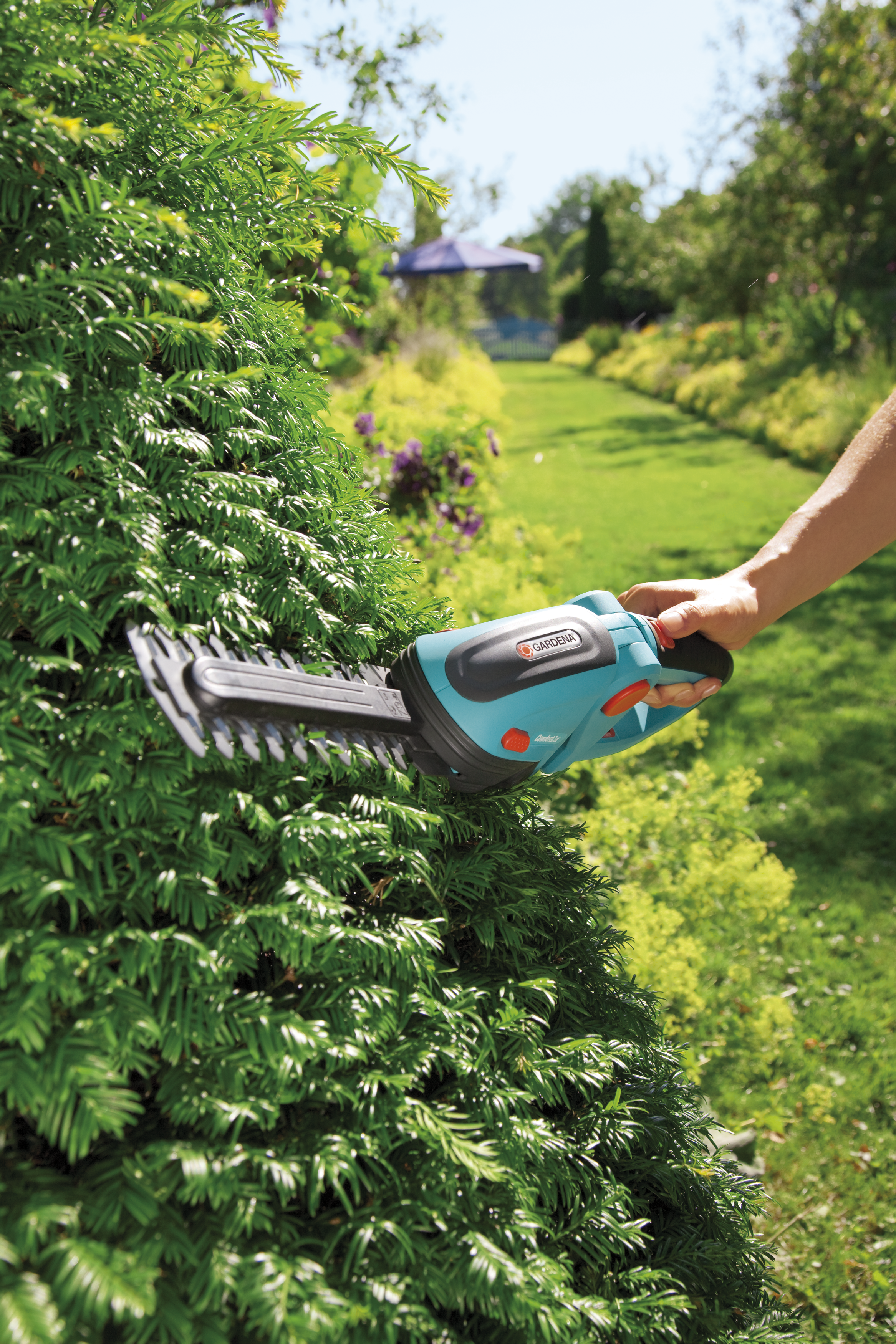 Акумулаторните ножици за храсти GARDENA ComfortCut с нож за храсти 18 см са идеални за удобно и безкабелно оформяне, за кастрене на издънки и за подрязване на храсти. Благодарение на високопродуктивната, лесна за поддръжка литиево-йонна батерия можете да работите интензивно и лесно. Светодиодният индикатор за нивото на зареждане на батерията дава постоянна информация за оставащото време за работа и показва навреме, кога батерията трябва да бъде заредена. С модела Comfort GARDENA обръща специално внимание на приятната употреба. В зависимост от приложението, удобната ръкохватка може да бъде накланяна и оптимално регулирана към естественото положение на ръката. Качествените ножове са прецизно шлифовани и с незалепващо покритие. Те могат да се сменят без инструменти; това е особено лесно, бързо и безопасно. С ножа за трева и храсти Ножиците за храсти бързо могат да се превърнат в ножици за трева за ефикасно оформяне на краищата на тревната площ. Акумулаторните ножици за храсти са в комплект със зарядно устройство и предпазител за ножа за безопасно съхранение. Към ножиците може да се добави Телескопична дръжка за удобна работа с високи живи плетове или за подрязване на нискорастящи храсти.