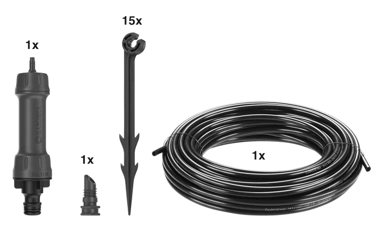 Комплектът за микрокапково поливане на редови зеленчуци/ растения (15 m) от GARDENA осигурява надеждно и спестяващо вода поливане на храсти, цветни лехи и деликатни култури. Всички елементи са включени в готовия за употреба комплект. Можете да монтирате комплекта само с три прости стъпки. Първо, свържете Главния модул 1000 с водопроводния маркуч, след това позиционирайте тръбата за капково поливане на растенията и я фиксирайте с тръбните фиксатори. От този момент, вашите редове с растения и зеленчуци с дължина 15 m, като например домати, са снабдени с вода. На всеки 30 cm в тръбата се вгражда капкообразувател. Дебитът на водата от вградените капкообразуватели е 1.6 литра на час. Благодарение на функцията за самопочистване, самопочистващите се капкообразуватели не се запушват поради лабиринтната технология. Можете да разширявате микрокапковата система по всяко време. С допълнителна тръба за капково напояване (арт. № 1362-20), можете да разширите комплекта до 30 m, а с Водния компютър от GARDENA можете да осигурите още по-удобно автоматично поливане. Микрокапкова система. Грижа за вашите растения и за всяка ценна капка. Лесно, точно, пестящо вода и време поливане.