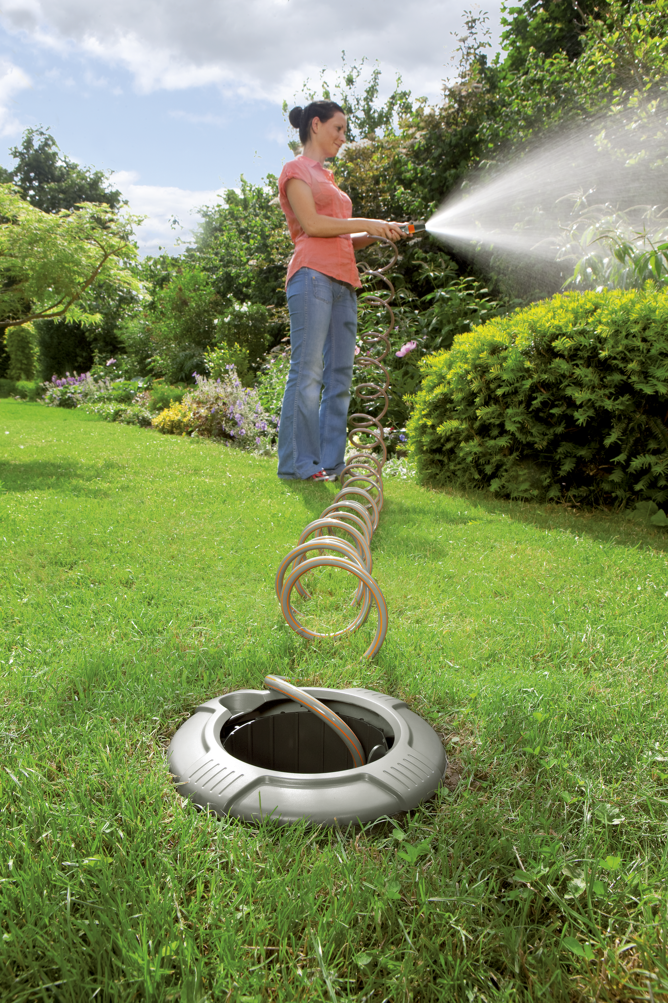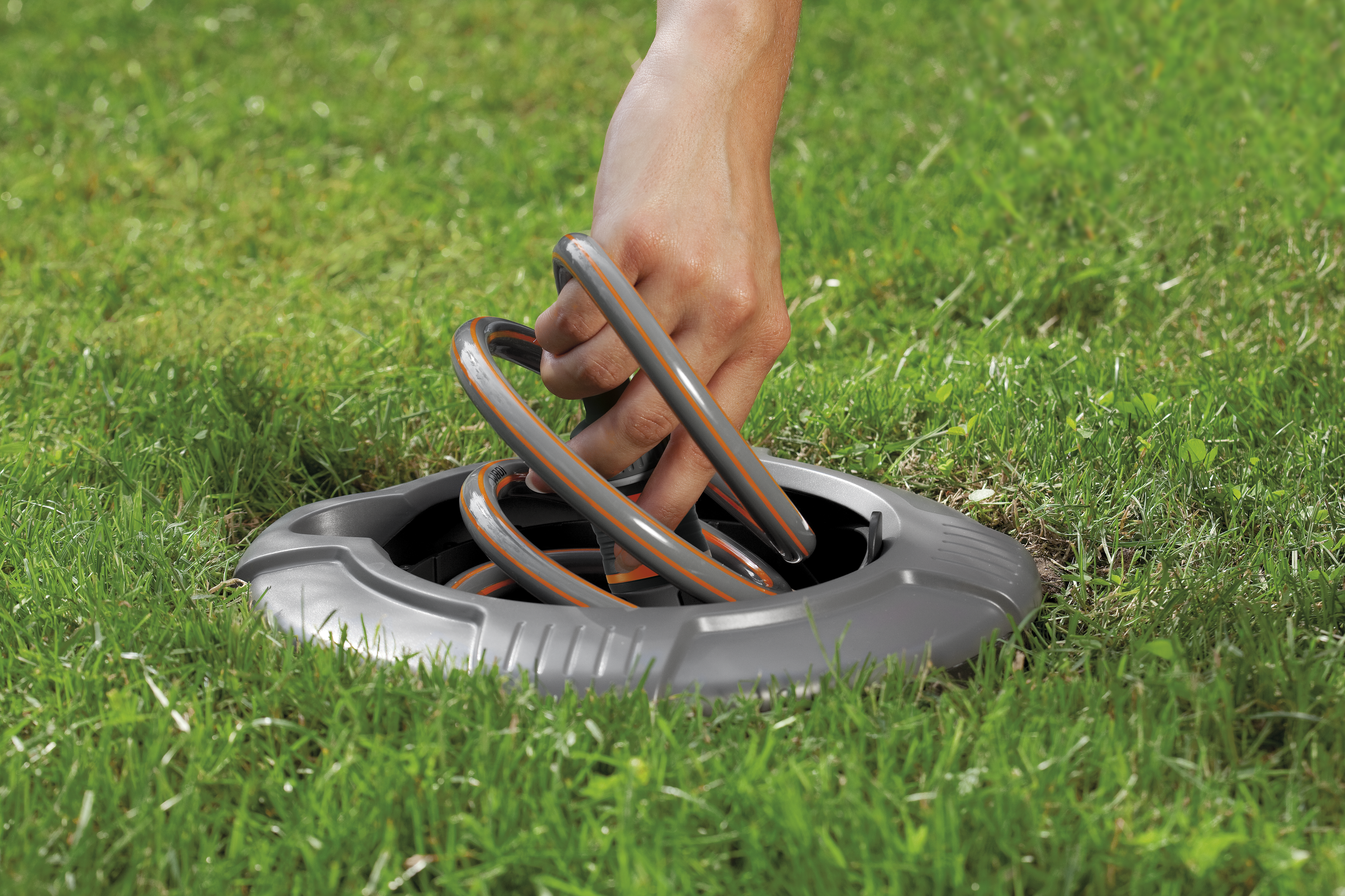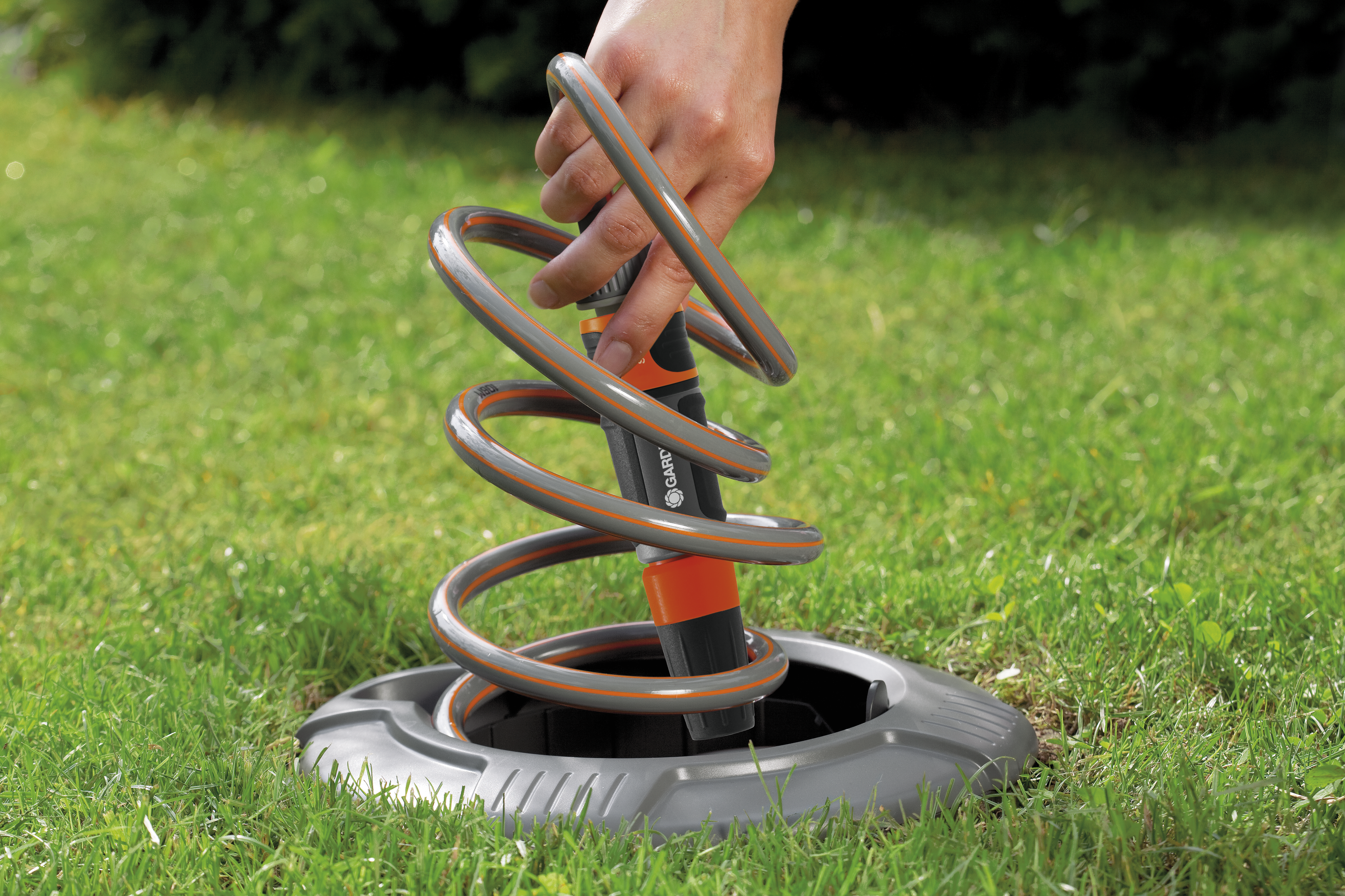 С кутията със спираловиден маркуч GARDENA водата може да се използва от земята, както електричеството от мрежата. А най-хубавото е, че е включен 10 м спираловиден маркуч със струйник Classic. При почистване или напояване, маркучът просто се изважда от кутията и след приключване на работата се връща. Вашата градина винаги ще бъде спретната - умно и изключително практично. Кутията със спираловиден маркуч се монтира под земята и се снабдява посредством свързващата тръба GARDENA. Когато кутията не се използва, капакът гарантира безопасността и спретнатия вид на градината ви. Този изскачащ сферичен капак се скрива в кутията, когато е отворен и така не представлява препятствие при косене. Кутията със спираловиден маркуч е оборудвана с бърза връзка, така че струйникът Classic може, например, лесно да бъде сменен с разпръсквач или удължен разпръсквач, без да капе вода при смяната. Кутията със спираловиден маркуч GARDENA има външна резба 1".