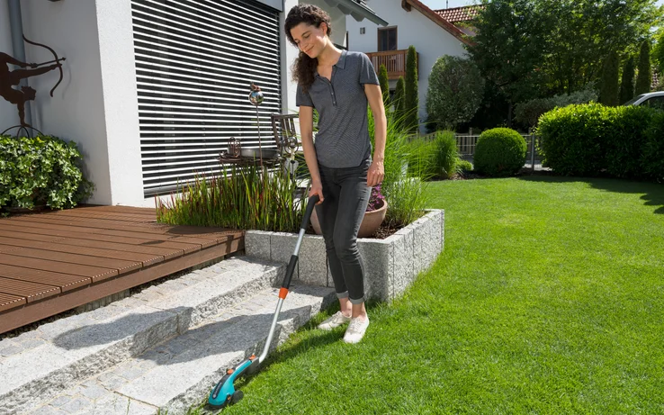 Using the GARDENA Set Battery Grass Shears ComfortCut Li, lawn edges can be conveniently and accurately cut; thanks to the Telescopic Handle and plug-on Wheels, it is possible to work particularly conveniently with an upright stance. The quality blades achieve perfect cutting results and can be released and replaced at the touch of a button, with no tools required. In this way, the Grass Shears can be easily turned into Shrub Shears. The plug-on Wheels facilitate easy guidance of the battery-powered shears over the grass. With integrated, easy-care lithium-ion battery. The battery can be quickly recharged at any time without memory effect. Complete with blade protection and charger.