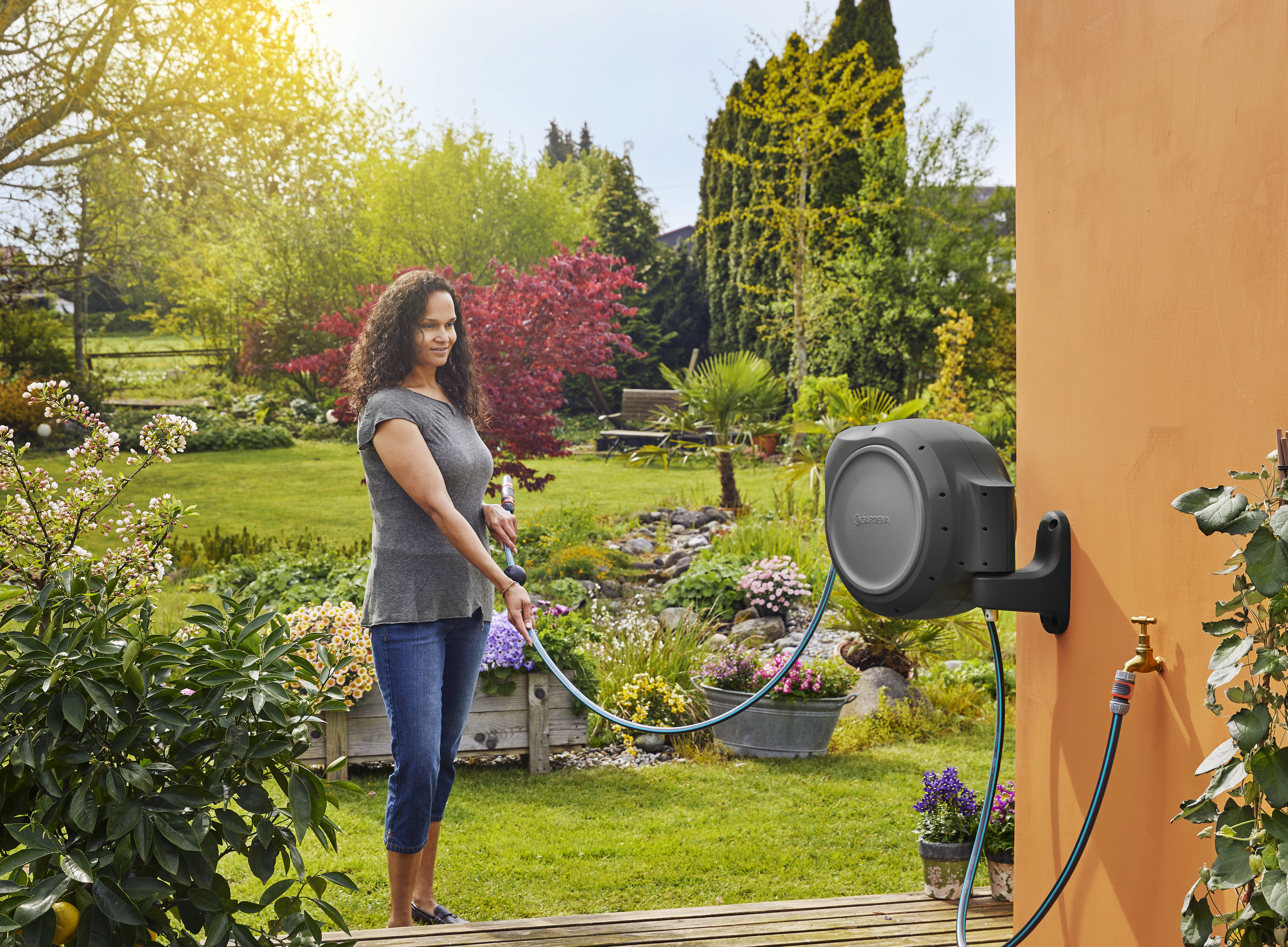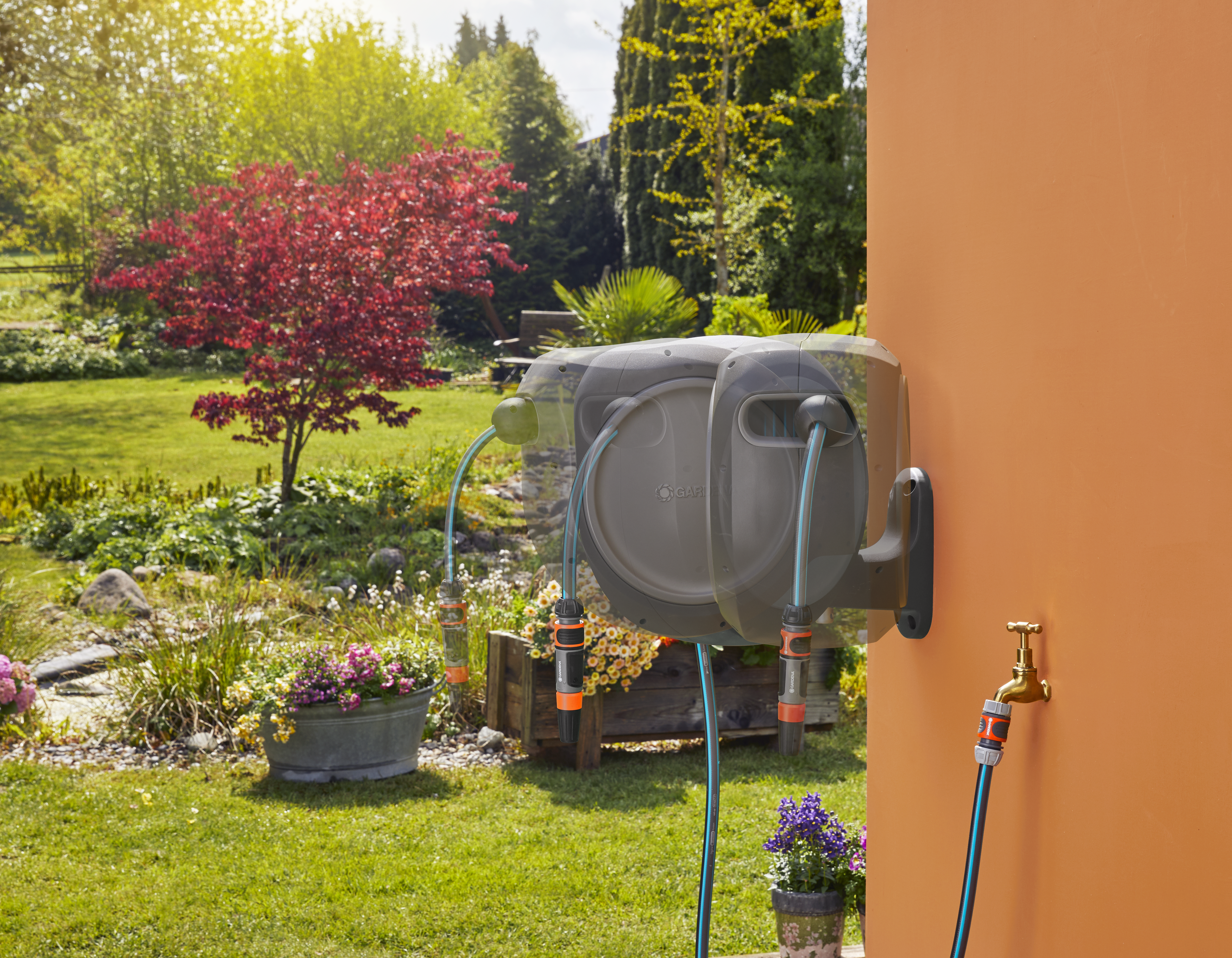 The GARDENA Comfort Wall-Mounted Hose Box 15 roll-up automatic makes watering especially easy and convenient. The retractable hose reel does the cranking for you. The hose can be conveniently withdrawn with little effort and stopped at short intervals of maximum 50 cm. The quality hose (no phthalates) prevents twisting / knotting and ensures a high water flow and optimal sprinkler operation. An integrated steel spring that is long lasting and perfectly suited for the hose length provides an slow and safe hose retraction. The integrated hose guide ensures an even coiling of the hose. Thanks to the sturdy wall bracket along with screws and wall plugs, mounting couldn't be simpler.