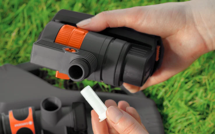 Maintenance is just as easy as operating the sprinkler. The nozzles are made of soft plastic, which makes cleaning significantly easier. If any lime is deposited on them, you can simply wipe it off by running your finger over the nozzles. In addition, a filter is built into the water connection to collect dirt particles. You can remove it easily and rinse it off under running water.