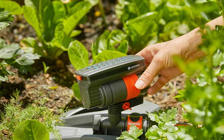 The sprinkler is fitted with a round base that allows it to remain consistently stable on the ground. This makes it particularly well-suited to being placed in the middle of a vegetable bed to water the plants all around it. The Compact Oscillating Sprinkler for Small Areas covers a generous area ranging from 97 to 2,325 sq.ft.. The settings slider allows you to flexibly determine both the range (10–59 feet) and the spray width (10–39 feet). The use of high-quality materials means that you can look forward to a Made in Germany 5-year manufacturer’s warranty, as well as the assurance that neither frost nor UV radiation can damage your GARDENA sprinkler.