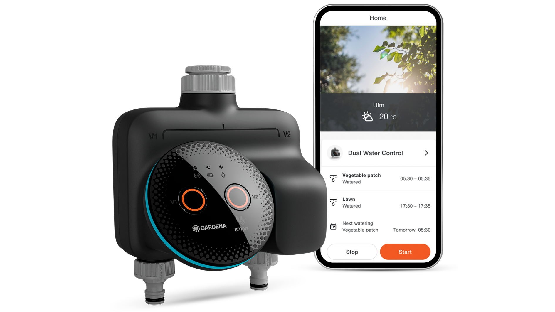 - Bewässert zwei Bereiche: Die smart Water Control wird mit zwei separaten Ventilen geliefert, die jeweils über eine eigene Steuerung verfügen.