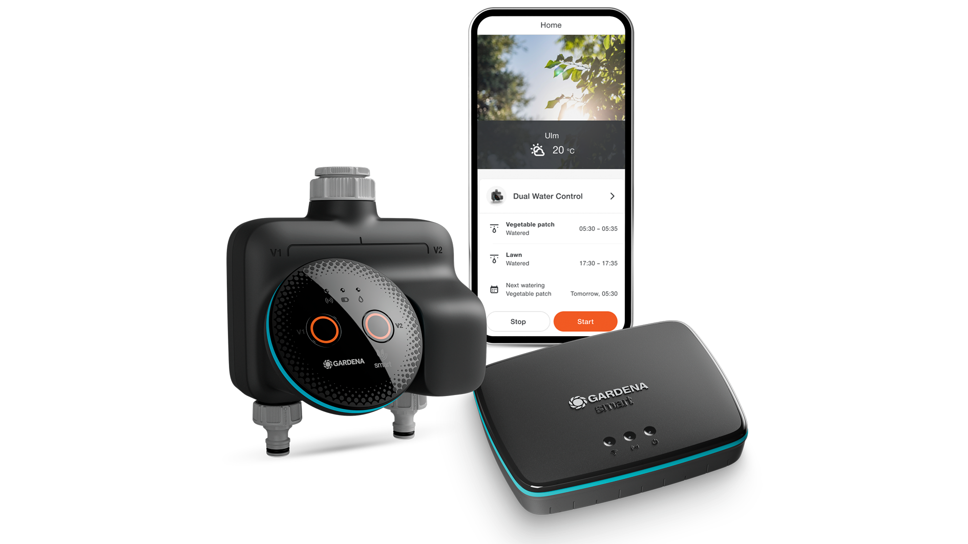 Das smarte Dual Water Control Set von GARDENA ermöglicht maßgeschneiderte, intelligente Bewässerungspläne*, um zwei verschiedene Bereiche eines Gartens unabhängig voneinander zu bewässern.