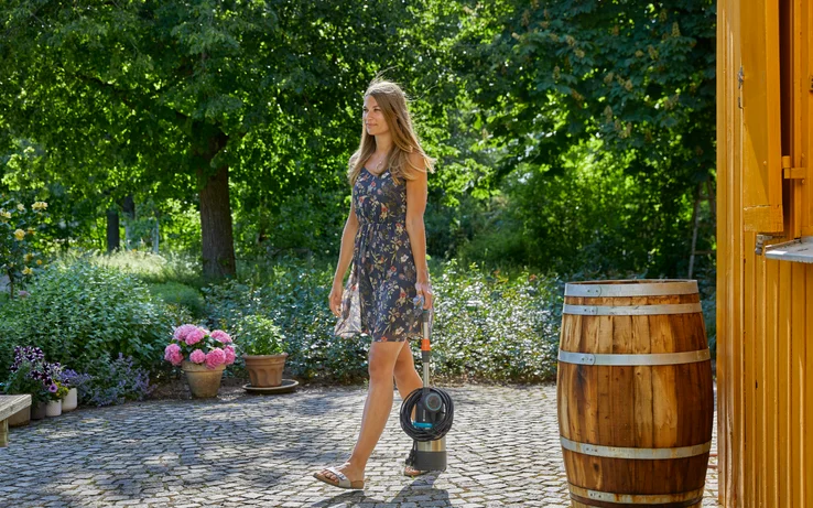 La pompe pour collecteur d’eau de pluie 4700/2 inox GARDENA est équipée d’un tube de refoulement coudé et télescopique en aluminium (de 67 à 87 cm) pour permettre un transfert de l'eau sans perte et d’une vanne de régulation pour régler le débit ou pour fermer complètement le passage de l’eau. Le transport de votre pompe pour collecteur d’eau de pluie est également très facile : suspendez le câble de connexion au-dessus du tube de refoulement coudé et utilisez-le comme poignée.