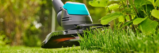 Gardena Grass Trimmer mowing grass next to a flowerbed