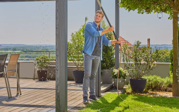 Il manico Cleansystem Flex di GARDENA è ideale per la pulizia a umido delle superfici più difficili da raggiungere, come le coperture dei terrazzi.