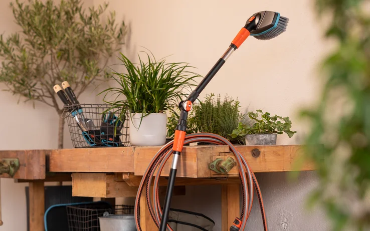 Basta collegare il manico ad acqua al tubo da giardino tramite il raccordo a innesto originale GARDENA. Ciò consente una pulizia efficace, poiché l’acqua viene convogliata tramite il manico direttamente alla spazzola, lì dove necessario. Ciò permette di pulire facilmente aree più ampie, come le coperture di terrazze, pergolati o serre. La pulizia è inoltre anche più comoda, poiché non è più necessario usare il secchio dell’acqua.