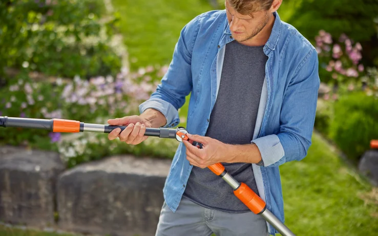 Il manico flex GARDENA estende il raggio di azione di 53 cm durante le attività di pulizia. In questo modo la pulizia di superfici orizzontali più alte, come i tetti di terrazze o carport sarà ancora più facile. In questo modo, non sarà più necessario usare la scala o altri attrezzi. Il manico è realizzato in alluminio robusto e di alta qualità e presenta un rivestimento confortevole.