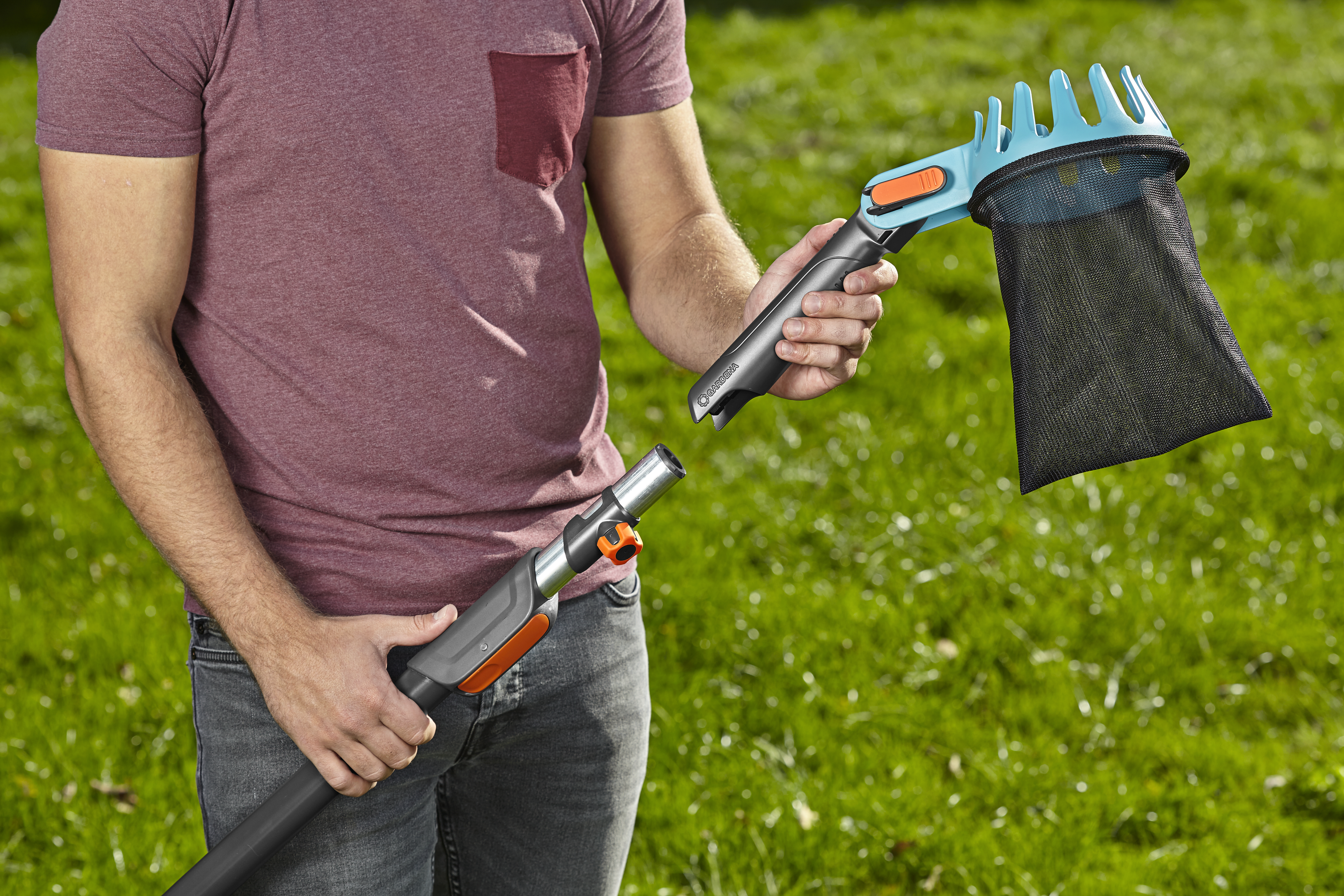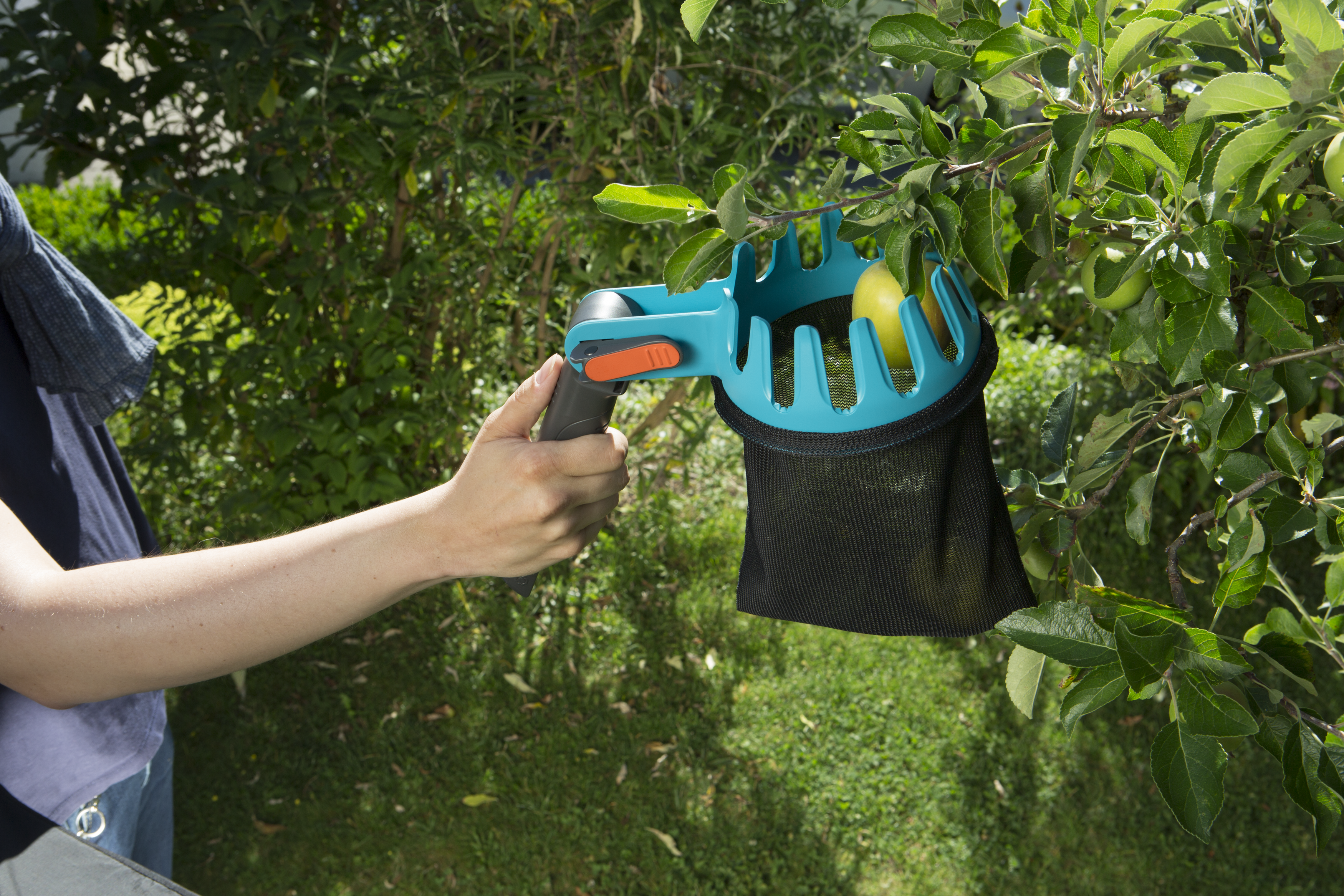 S GARDENA combisystem česačem ovoce snadno sbíráte a trháte ovoce. GARDENA combisystem umožňuje flexibilní používání díky vyměnitelným koncovým nástrojům. Česač ovoce je kompatibilní se všemi násadami z řady GARDENA combisystem a lze jej nasadit a zajistit pomocí šroubu. S teleskopickou násadou GARDENA combisystem (č. v. 3721-20) můžete trhat plody ve výšce až pěti metrů. Pevné spojení mezi česačem ovoce a násadou zajišťuje vždy pohodlnou práci. Díky rukojeti na přenášení můžete sbírat plody na nižších stromech nebo nízko visících větvích i bez použití násady combisystem. Pracovní úhel můžete změnit pomocí páky pro rychlé zablokování a přizpůsobit tak česač ovoce svým potřebám. Malé zoubky mezi plastovými hroty vám umožní snadno trhat menší plody. Pevná záchytná taška je vyrobena ze síťového materiálu, takže obsah tašky vždy vidíte. Pro prostorově úsporné skladování můžete použít combisystem věšák na nářadí Flex (č. v. 3505-20). GARDENA podporuje česač ovoce combisystem zárukou v trvání 25 let. Rozšiřte svou rodinu nástrojů. GARDENA combisystem. Možnost výměny koncových nástrojů. Odolnost. Pro jakékoliv zahradní práce.