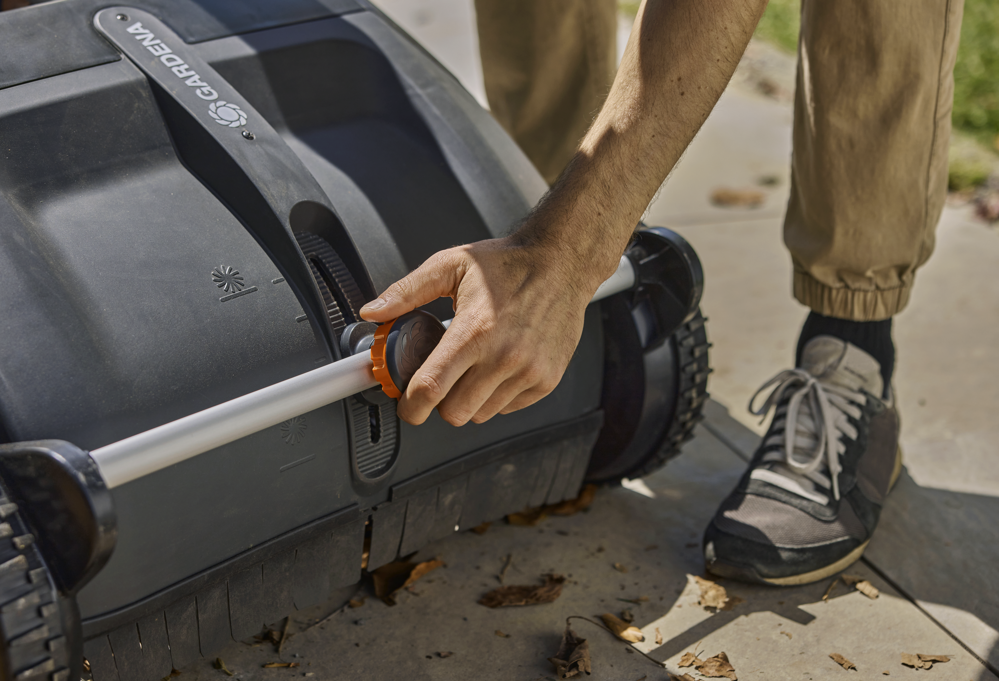 Mit dem einfach zu bedienenden Drehknopf an der Vorderseite kannst Du die Bürstenhöhe des Laubsammlers für Rasen und Terrassen ganz leicht an verschiedene Oberflächen anpassen. Egal, ob Du vom Gras auf die Terrasse wechselst oder umgekehrt – die richtige Einstellung sorgt dafür, dass Laub und Schnittgut zuverlässig und gründlich aufgenommen werden.