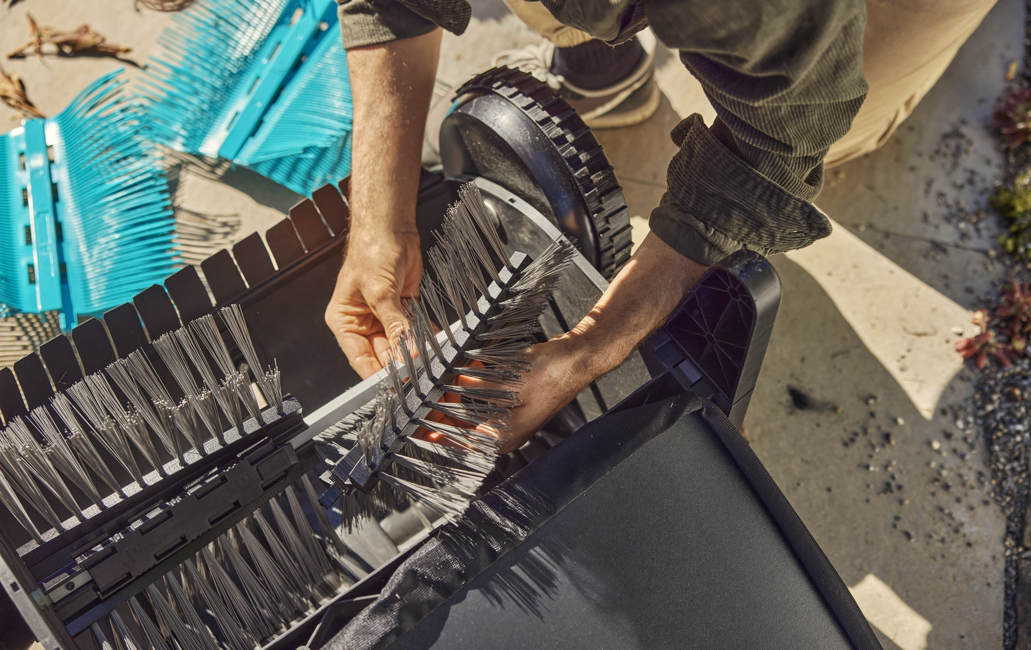 : Die Bürsten haben über ein speziell entwickeltes Helix-Design für das Sammeln auf der Terrasse. - Einfaches Tauschen der bürsten: Die Bürsten lassen sich eines integrierten Verriegelungsmechanismus schnell und ohne Werkzeug wechseln.