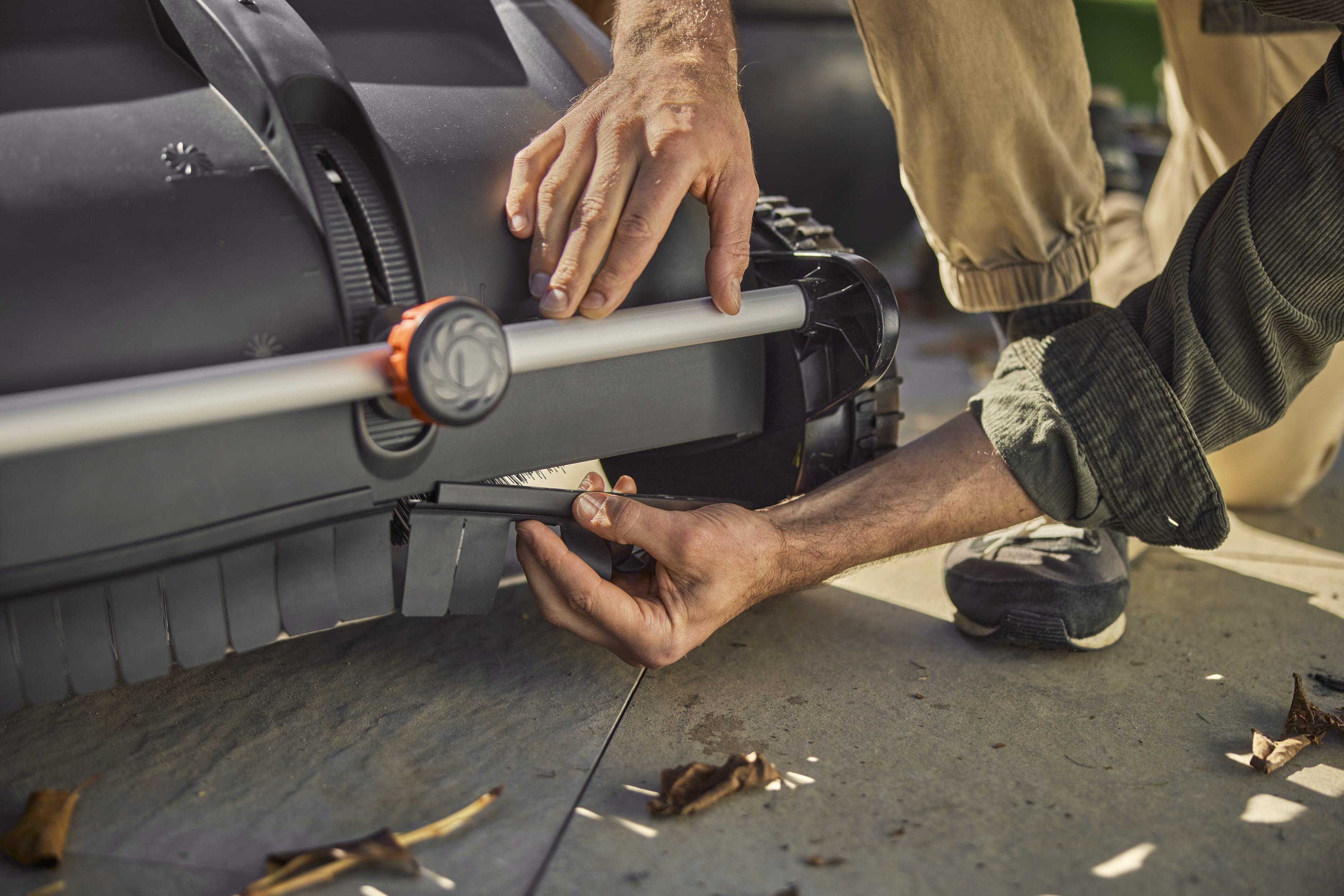 Der Frontspoiler verbessert das Einsammeln von Laub auf kurzem Gras und Terrassen spürbar. Einmal angebracht, bleibt er zuverlässig an Ort und Stelle und kann problemlos im gesamten Garten verwendet werden – ganz ohne erneutes Justieren.