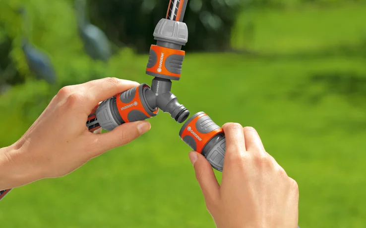 Gracias a la derivación triple, las mangueras pueden ser ramificadas. Esto permite el trabajo simultáneo en el jardín, por ejemplo, se puede regar el césped mientras se usa la manguera para regar las macetas. El conjunto incluye todos los accesorios necesarios para la ramificación de una manguera.