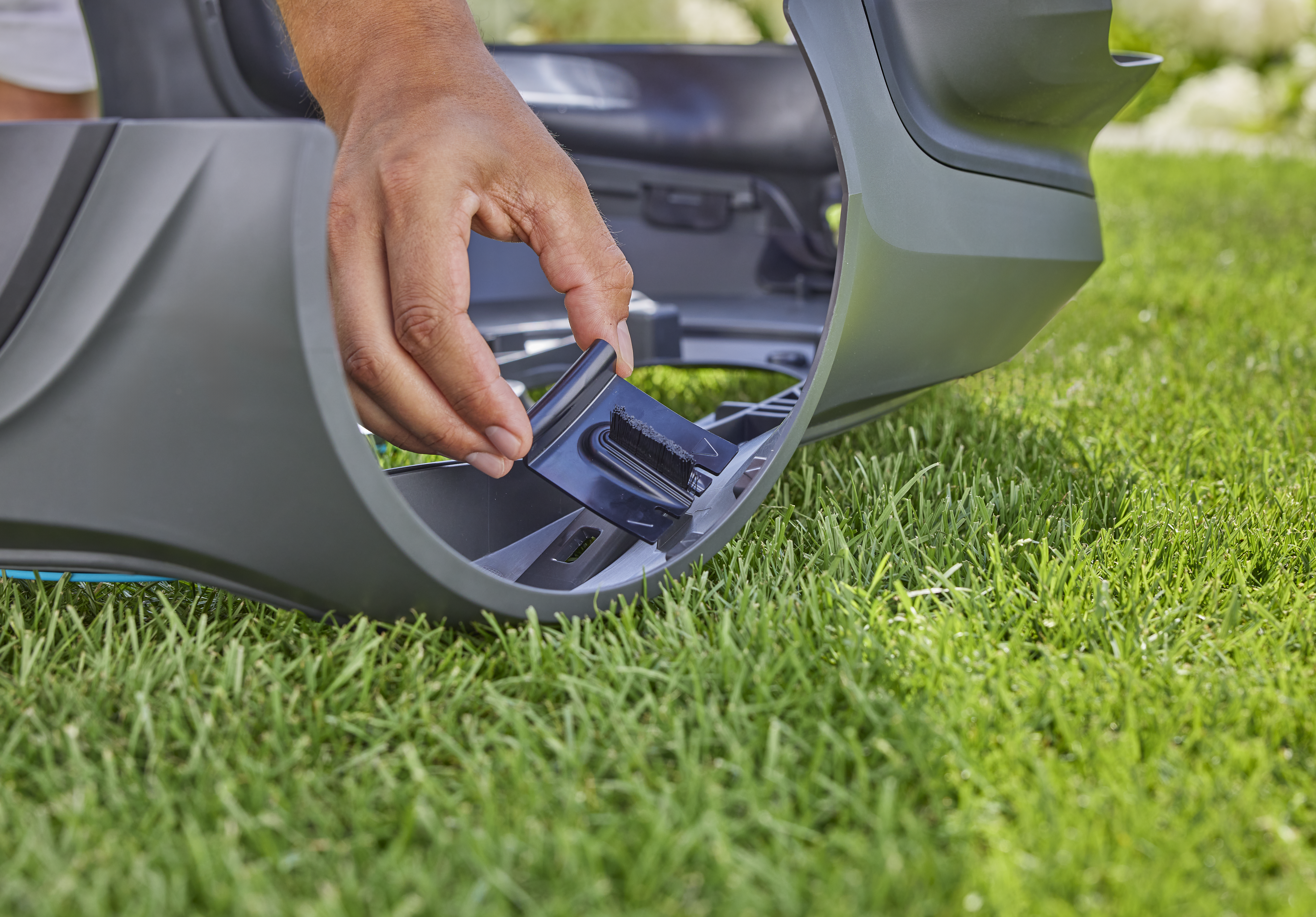 Ostaci trave mogu se lijepiti za kotače, smanjujući njihovu učinkovitost pri košnji na padinama. Četke za kotače robotske kosilice GARDENA SILENO osiguravaju da je robotska kosilica uvijek učinkovita na travnjaku.