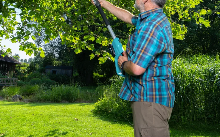 Anche con una scala, spesso è difficile raggiungere i rami in cima agli alberi, ma la potatura è spesso necessaria anche ad altezze elevate. Ora non c'è più bisogno di arrampicarsi: grazie al potatore telescopico a batteria TCS 20/18V P4A GARDENA è possibile lavorare da terra con un solido appoggio.