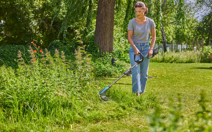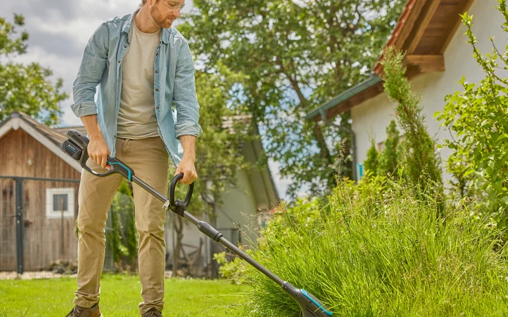 Il decespugliatore a batteria PowerTrim GARDENA è il perfetto alleato contro l'erba fitta! Set completo con batteria POWER FOR ALL.