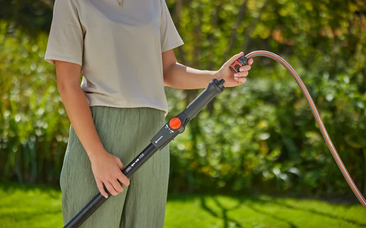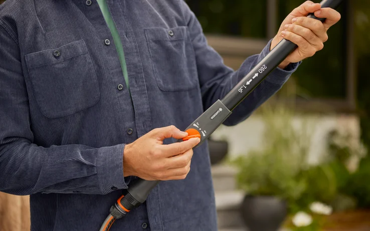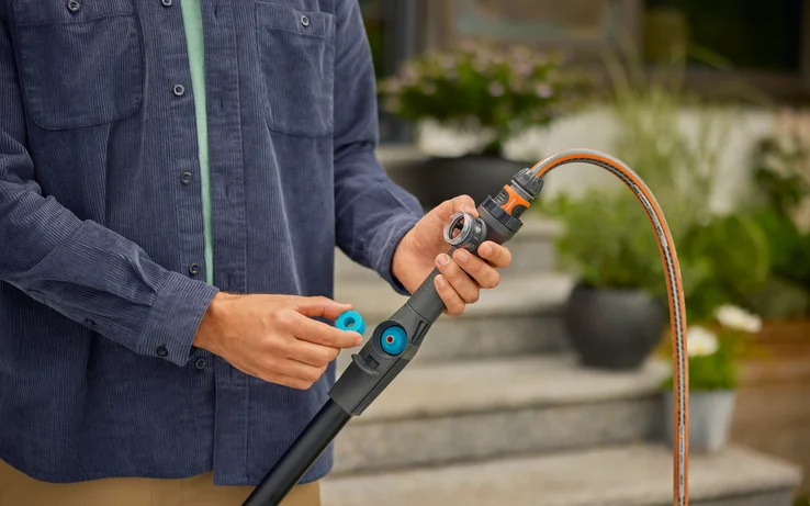 Dopo aver collegato il tubo da giardino con un solo gesto, l’erogazione dell’acqua può essere regolata e interrotta in modo continuo direttamente nel manico. In questo modo, la regolazione del flusso idrico è ancora più semplice ed elimina la necessità di recarsi regolarmente al rubinetto.
