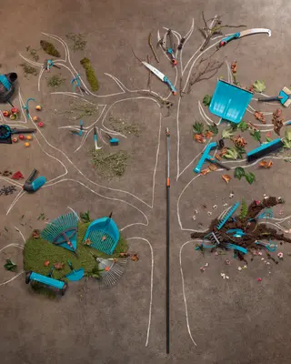 Artistic arrangement of Gardena gardening tools and accessories forming a tree shape.
