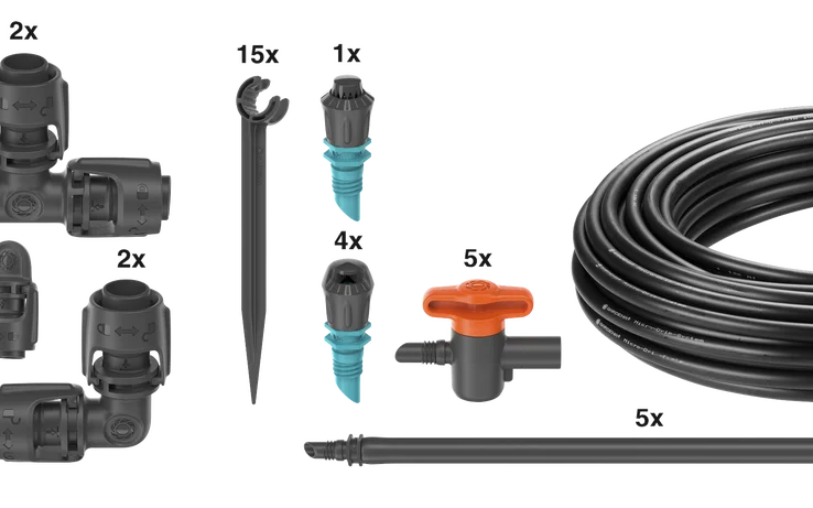 GARDENA lašelinis drėkinamasis rinkinys daržovių lysvėms / gėlynams. Šis rinkinys yra idealus, jei norite efektyviai laistyti iki 40 m² augalų ir gėlių plotus smulkia purškimo dulksna. Su Ready-2-Use rinkiniu esate pasiruošę sumontuoti visus komponentus vos keliais paprastais veiksmais. Dėl pridedamų prailginimo vamzdžių ir dviejų skirtingų purškimo antgalių jūsų augalai bus optimaliai drėkinami net ir po augimo spurto. Rinkinys auga kartu su jūsų augalais. Padidinkite purškimo aukštį prailginimo vamzdžiu, kad toliau drėkintumėte daržoves ar gėles iš viršaus smulkia dulksna. Reguliavimo vožtuvų pagalba galite nustatyti purškimo diapazoną. Patentuotos „Quick & Easy“ sujungimo technologijos dėka galite bet kada pertvarkyti komplekte esančius MDS komponentus ir naujai panaudoti jų nepažeidžiant. Tai daro juos tvariais. Kad būtų dar daugiau patogumo ir paprastumo, derinkite komplektą su GARDENA vandens valdikliu (pvz., Select art. Nr. 1891-20). Taip galite nustatyti laistymo grafikus ir jūsų augalai bus laistomi automatiškai, net kai jūsų nėra namuose. Micro-Drip-System. Rūpinkitės savo augalais ir kiekvienu brangiu lašu. Lengvas, tikslus, vandenį ir laiką taupantis laistymas.