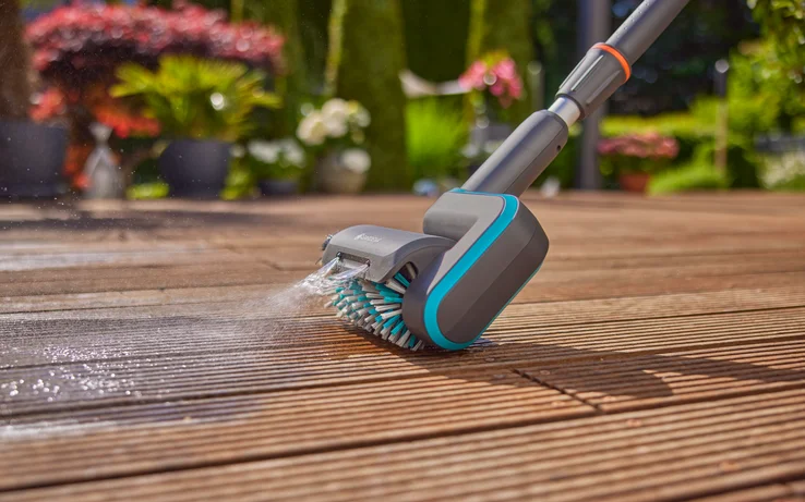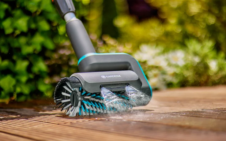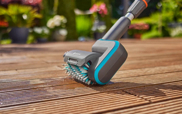 GARDENA AquaBrush Barrel Brush Universal nodrošina bez piepūles un efektīvu koka virsmu, piemēram, koka terases grīdu, tīrīšanu.