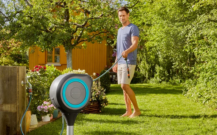 Dārza šļūtenes kārba RollUp M nodrošina maksimālu pārvietošanās brīvību jūsu vidēji lielā dārza laistīšanas laikā