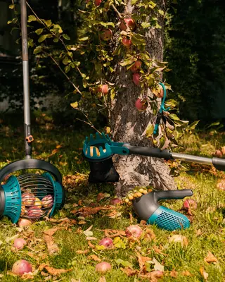 Gardena fruitplukker en tuingereedschap onder een appelboom met gevallen appels.