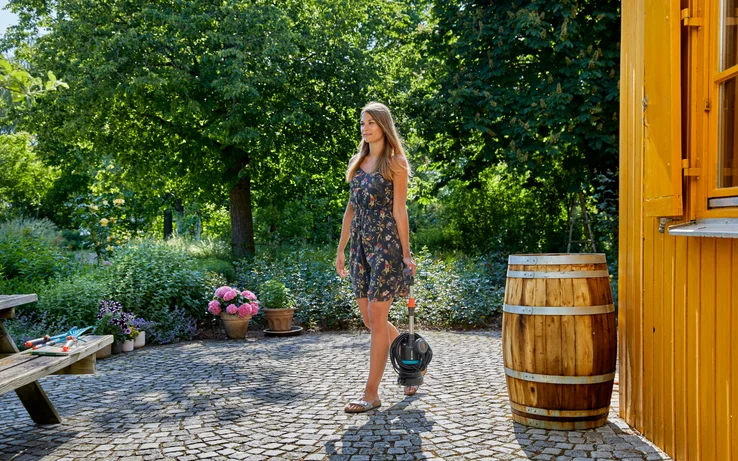 Reguleringsventilen lar deg justere eller stenge vannstrømmen, og det innebygde filteret beskytter pumpen mot smuss og er lett å rengjøre. Med sin slanke konstruksjon passer pumpen i åpninger fra 150 mm, og kan brukes med GARDENA Aqua spreder og Micro-Drip-System for effektiv regnvannsvanning.
