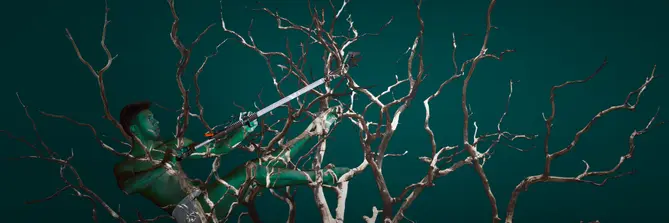 En mann som bruker en Gardena EasyCut Lopper til å klippe en gren av et tre