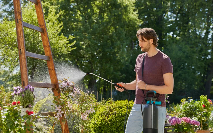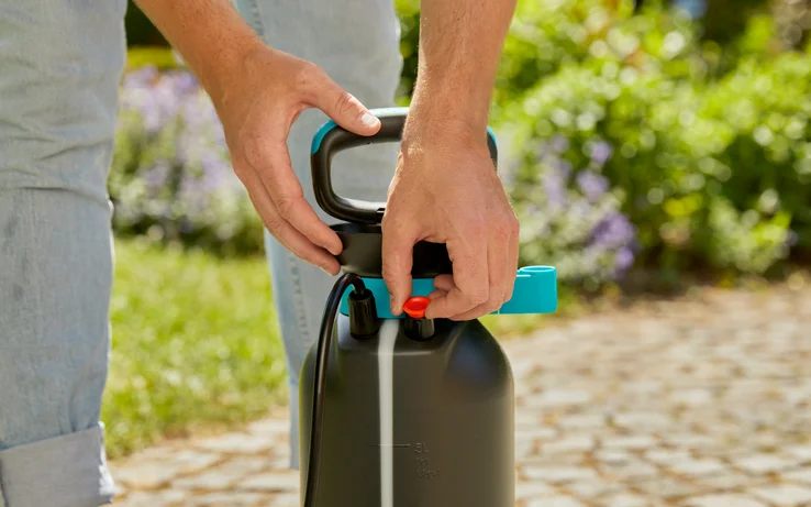 The GARDENA Pressure Sprayer 5 L Comfort is perfectly suited to precisely and efficiently treating your flowers, shrubs and even trees - whether they need spray watering, fertilising or even plant protection. Building up pressure in the 5-litre container can be easily done by pumping the practical D-handle up and down. With the help of its ergonomic foot treads, the tank always stays firmly in place whilst pumping.