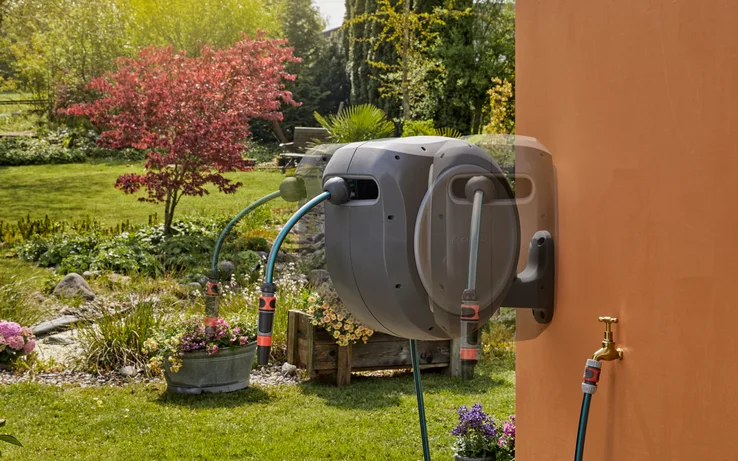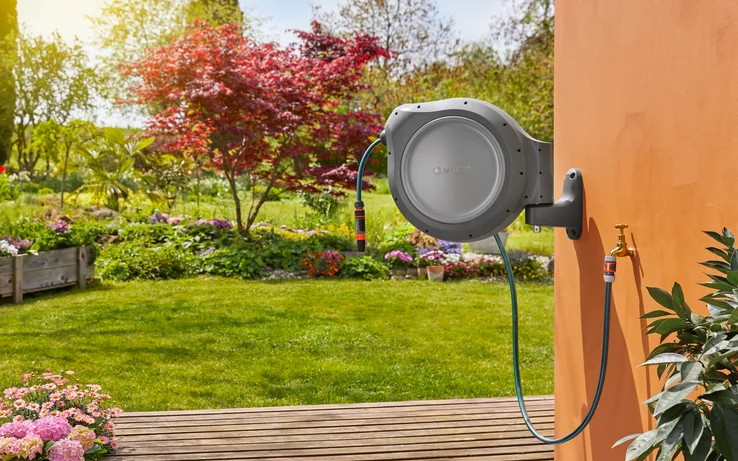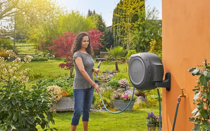 Compact and ready for immediate use: The 30m retractable hose reel for larger gardens