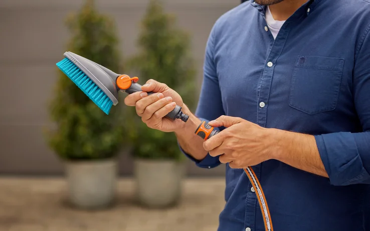 Twarde włosie szczotki zostało opracowane specjalnie z myślą o wszystkich mniej delikatnych powierzchniach zewnętrznych. Idealnie nadaje się do dokładnego czyszczenia małych, wytrzymałych powierzchni na balkonach, tarasach lub w ogrodzie. Dzięki twardej szczotce przewodzącej wodę gruby i uporczywy brud można usunąć w mgnieniu oka.