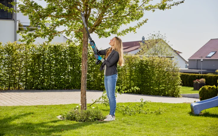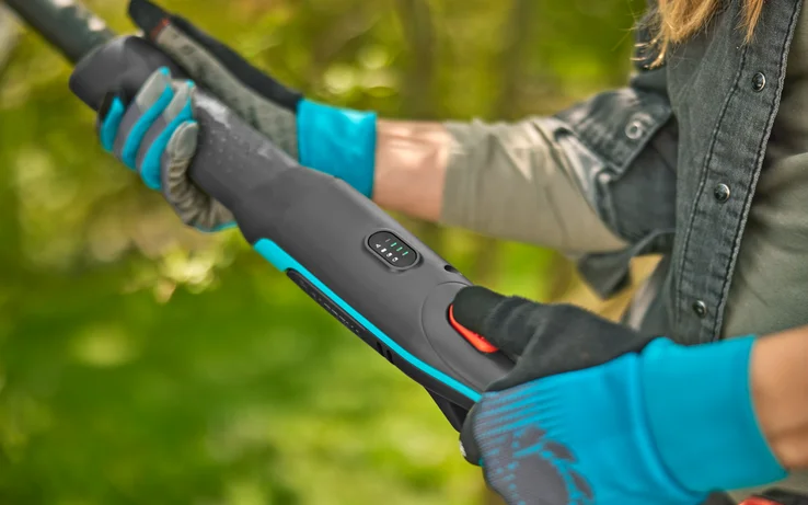 The Battery Pruning Loppers EasyCut 110/18V P4A solo from GARDENA help you cut branches in trees and shrubs with ease. Its low weight of only 1.9 kg makes it comfortable to hold in your hands during tree care. You can comfortably reach branches up to 2.5 m high from the ground. The powerful support of the POWER FOR ALL battery allows you to make cuts without using too much force. The original GARDENA blades, made in Germany from hardened steel, ensure a clean and smooth cut in fresh wood with a diameter of up to 28 mm. As they are non-stick coated as well as precision ground, cuttings do not stick to the slim cutting head. The EasyCut provides comfortable handling with a perfect balance thanks to the ergonomic handle. An LED indicator is integrated in the handle to show you the charging status of the battery. The GARDENA Battery Pruning Loppers EasyCut 110/18V P4A solo are supplied without quick charger and powerful 18V POWER FOR ALL battery. You can use any battery system of the POWER FOR ALL ALLIANCE. The POWER FOR ALL ALLIANCE is one of the largest cross-brand battery alliances of leading manufacturers, whose batteries can be used in numerous devices for garden and house. This allows you to save money while remaining flexible! You can also buy the device together with the rechargeable battery as a Ready-To-Use Set (Art. No. 14772-20). After a simple online registration, GARDENA offers a manufacturer's warranty of three years on the Battery Pruning Lopper. Passion powered by GARDENA. ONE battery system for all tasks in your garden.