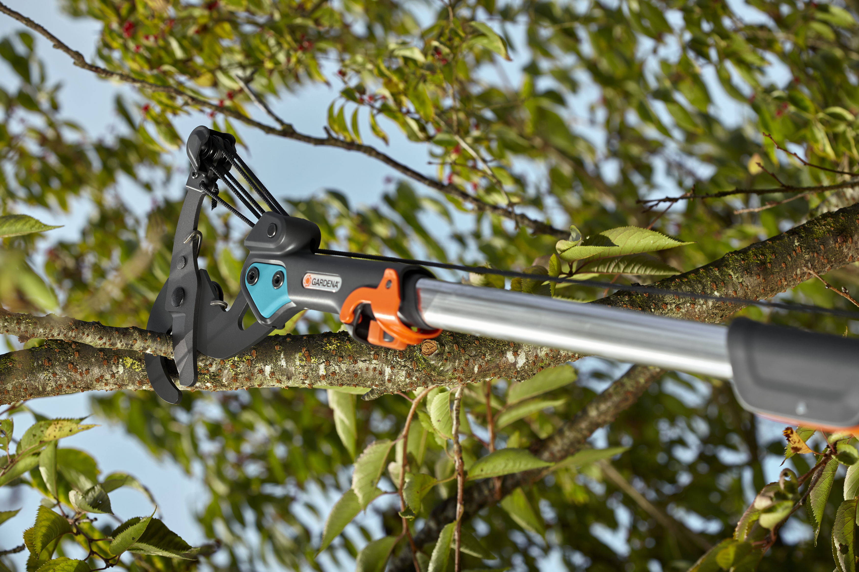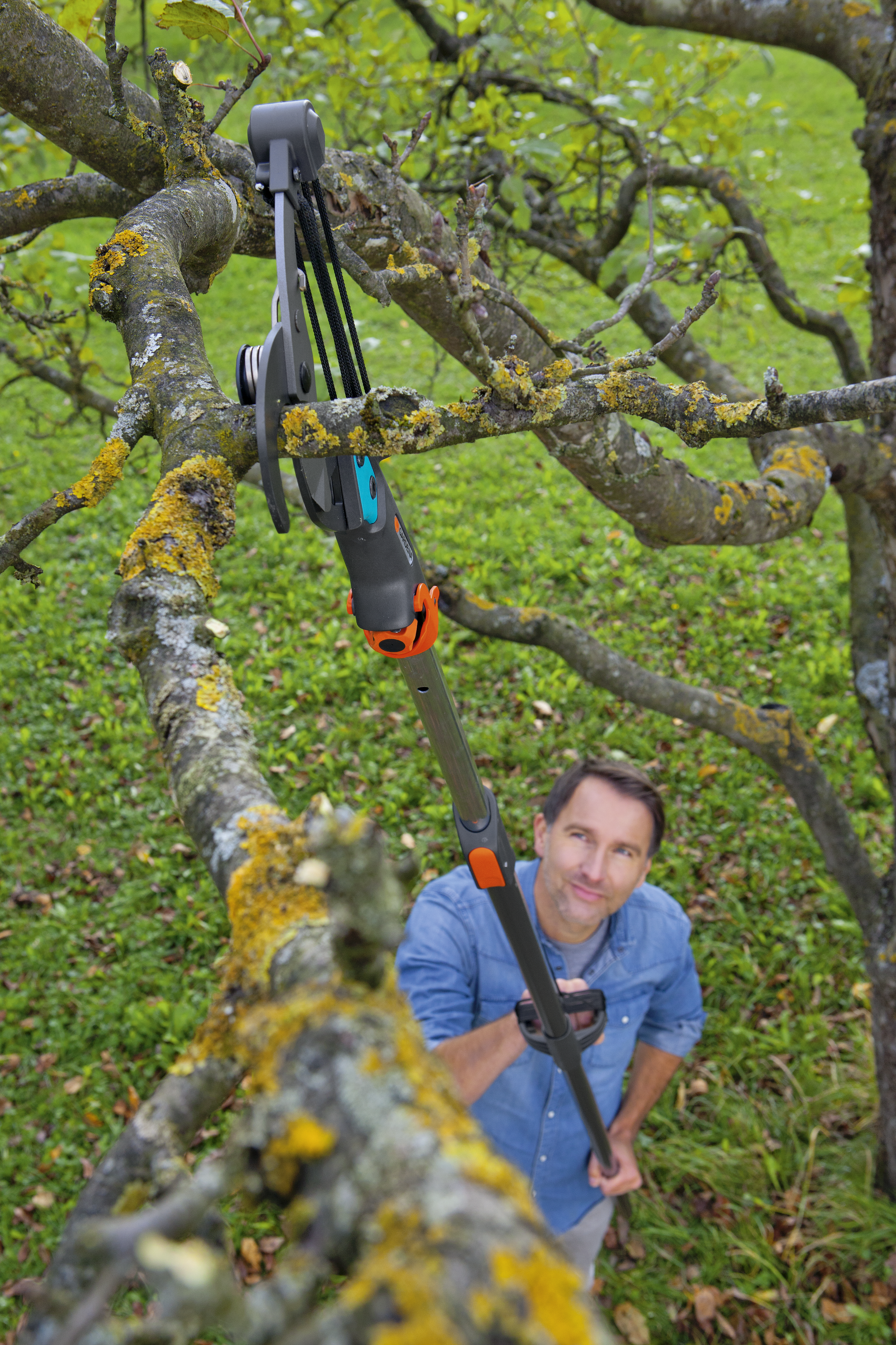 A Tesoura para Ramos de Bypass GARDENA combisystem com uma transmissão de 5 passos é adequada ao corte de ramos frescos em árvores altas. Em combinação com um Cabo Telescópico GARDENA combisystem, os ramos podem ser facilmente cortados a partir do chão, sem precisar de escadote, e aparados até grandes alturas. O bloqueio de segurança garante que a ligação permanece segura. A transmissão integrada de alavanca dupla e a transmissão de 5 passos permitem uma enorme economia de esforço. Isto garante o corte sem esforço de ramos de aprox. 35 mm de diâmetro. As lâminas com revestimento antiaderente e geometria ajustada para fixação definida dos ramos (o ramo não se move ao cortar) garantem um corte limpo e preciso, assim como uma fácil limpeza. Particularmente prático: a tesoura pode ser pendurada nos ramos, o que resulta num esforço de corte ainda menor. Funcionamento potente, prático e ergonómico graças à pega em D ajustável. A pega em D permite arrumar a corda (para que não se enrole enquanto trabalha/durante a arrumação) com um ponto de fixação para a extremidade da corda em ambos os lados. A corda de puxar tem 4,7 m de comprimento e é à prova de desgaste, podendo ser facilmente utilizada. A Tesoura para Ramos com Bigorna pode também ser utilizada sem cabo. O período de garantia é de 25 anos.