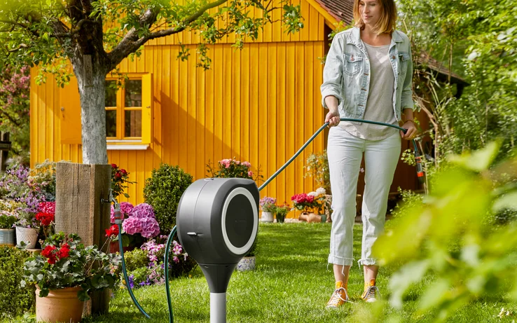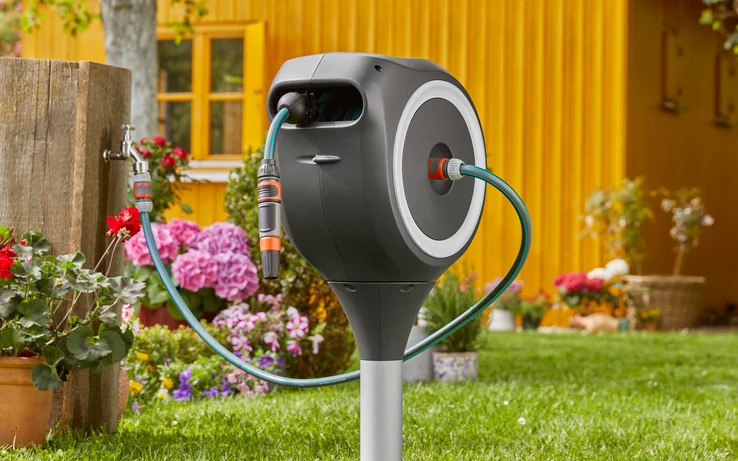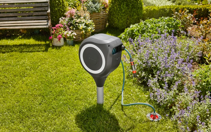 Rega sempre pronta para a ação: o porta-mangueira de jardim RollUp S da GARDENA não é uma caixa de arrumação de mangueira comum. Irá deliciar-se com a facilidade de rega para o seu jardim com este porta-mangueira de excelente design. Pode regar facilmente o seu pequeno jardim e ter o máximo de liberdade de movimentos. Apoio sobre um resistente pico metálico, o que significa que pode instalá-lo em qualquer lugar do seu jardim sem danificar as paredes. A extremidade para o solo é enroscada na terra com uma vareta de montagem e, por isso, é extremamente estável. Para utilizar, basta esticar a mangueira de jardim até um máximo de 15 metros e poderá começar a regar de imediato. Os pontos de bloqueio curtos incorporados garantem um manuseamento sem esforço e fixam automaticamente a mangueira consoante o comprimento de extensão pretendido. Graças ao design inovador, a caixa de mangueira pode ser rodada mais de 360° e pode chegar a todos os recantos do seu jardim. O porta-mangueira prossegue com os seus movimentos enquanto rega e evita que a mangueira de água se dobre ou se enrede. Além disso, este porta-mangueira de jardim evita rotações extenuantes, agachar-se, molhar-se e sujar as mãos ao enrolar: um puxão curto da mangueira desenrolada ativa a mola integrada, que rebobina a mangueira de forma totalmente automática e fiável. Para garantir que não se produzem bloqueios ou torções, uma guia de mangueira mantém a mangueira de jardim no percurso correto, e a tecnologia RollControl garante uma recolha segura e controlada. O porta-mangueira ajusta-se à altura dos robots corta-relva GARDENA, pelo que a relva em redor do porta-mangueira mantém-se sempre cortada. O material de alta qualidade encontra-se protegido por proteção contra a geada e raios UV, e pode permanecer no jardim o ano inteiro, garantindo uma longa vida útil e uma utilização sem manutenção. A caixa é particularmente compacta e possui um design elegante para que se possa integrar facilmente em qualquer jardim. Inclui uma mangueira de ligação flexível, todas as peças de montagem necessárias e elementos do sistema Original GARDENA, assim como um pulverizador com dois padrões de pulverização diferentes. A GARDENA oferece uma garantia de cinco anos para o Porta-mangueira de Jardim RollUp S.