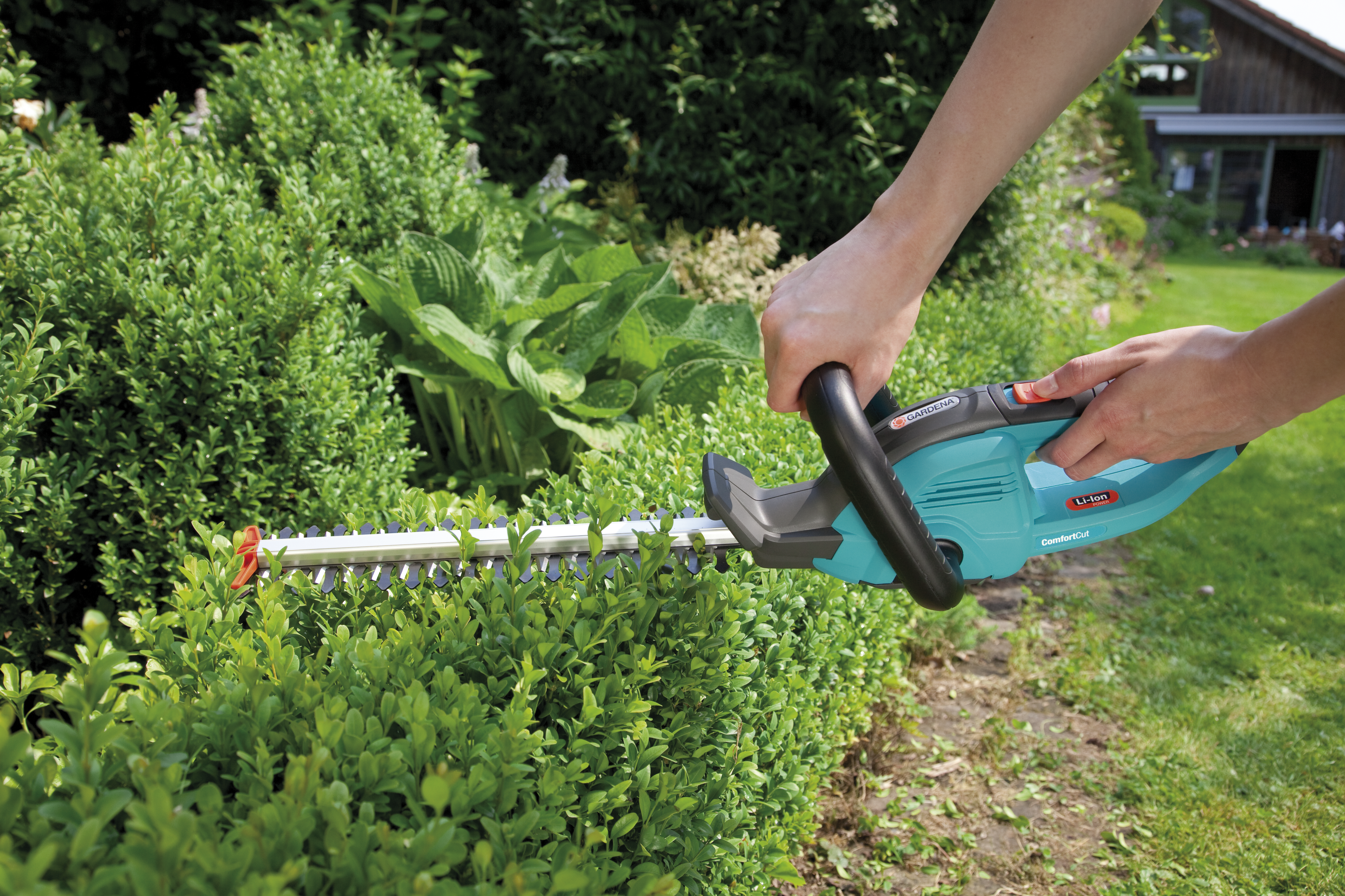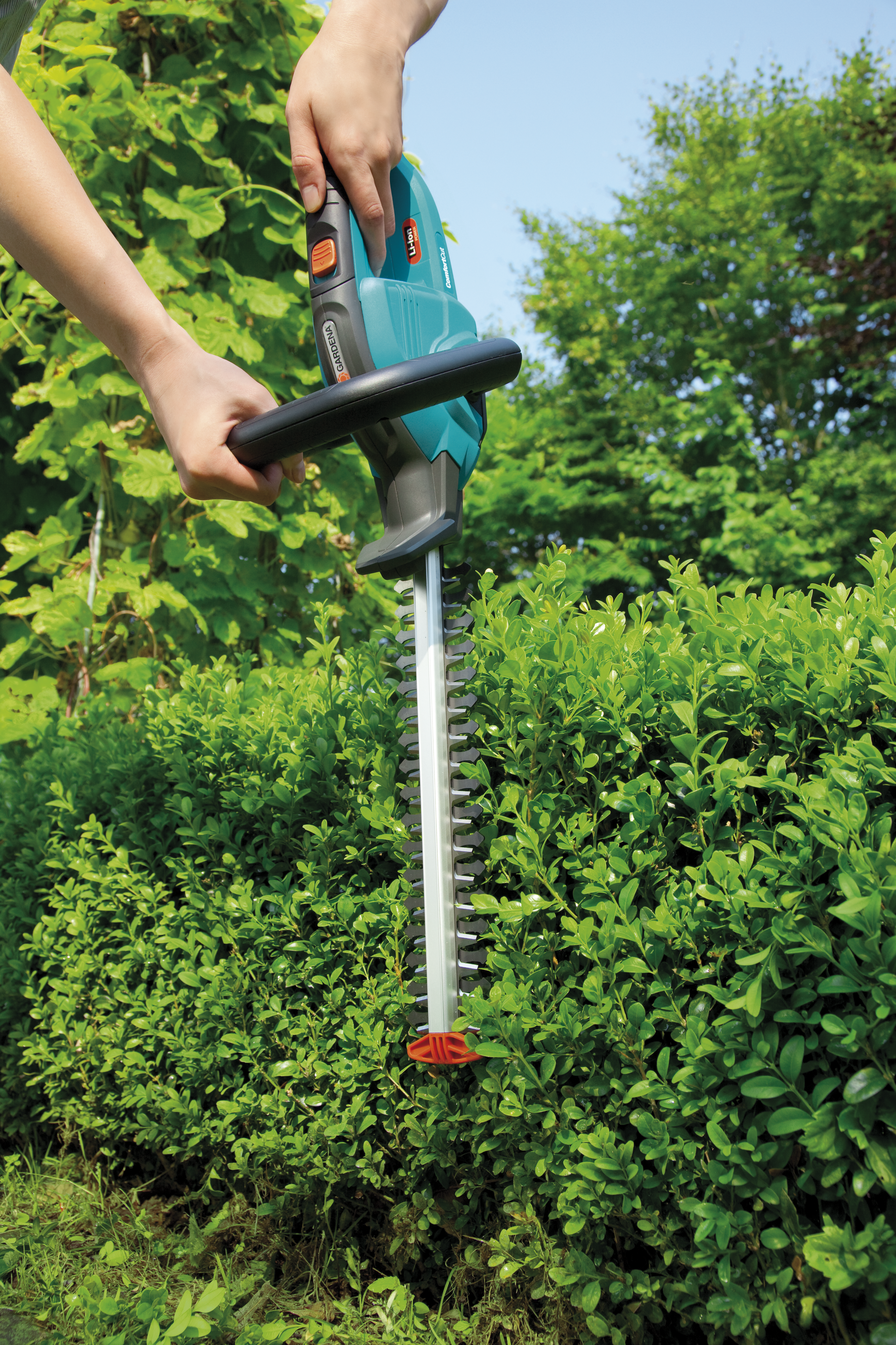 Foarfecele pentru arbuşti cu acumulator ComfortCut 30 GARDENA este ideal pentru tăierea uşoară şi fără cablu a gardurilor vii şi a arbuştilor. Foarfecele pentru arbuşti cu acumulator are o greutate redusă şi este uşor de utilizat, iar lungimea de tăiere de 30 cm permite să se lucreze confortabil. Crengile cu un diametru de până la 8 mm pot fi tăiate. Pentru o tăiere uşoară, în forţă, foarfecele pentru arbuşti este dotat cu baterii litiu-ion reîncărcabile, de înaltă performanţă şi uşor de întreţinut. Ecranul cu LED pentru nivelul de încărcare a bateriei oferă o afişare constantă a timpului de acţionare rămas şi afişează intervalul de timp după care bateria trebuie reîncărcată. Foarfecele pentru arbuşti cu acumulator stă bine în mână datorită mânerului ergonomic, iar un mâner suplimentar facilitează manevrarea. Puterea mare oferă rezultate extraordinare de tăiere. Pentru a lucra în siguranţă în timpul tăierii aproape de sol, apărătoarea împotriva impactului de la capătul lamei protejează împotriva reculului. Foarfecele pentru arbuşti cu acumulator include un încărcător de baterie şi o apărătoare de lamă pentru o depozitare sigură. Pentru a lucra confortabil chiar şi la gardurile vii mai înalte sau pentru a tăia plantele de pe sol, se poate adăuga foarfecelui un mâner telescopic.