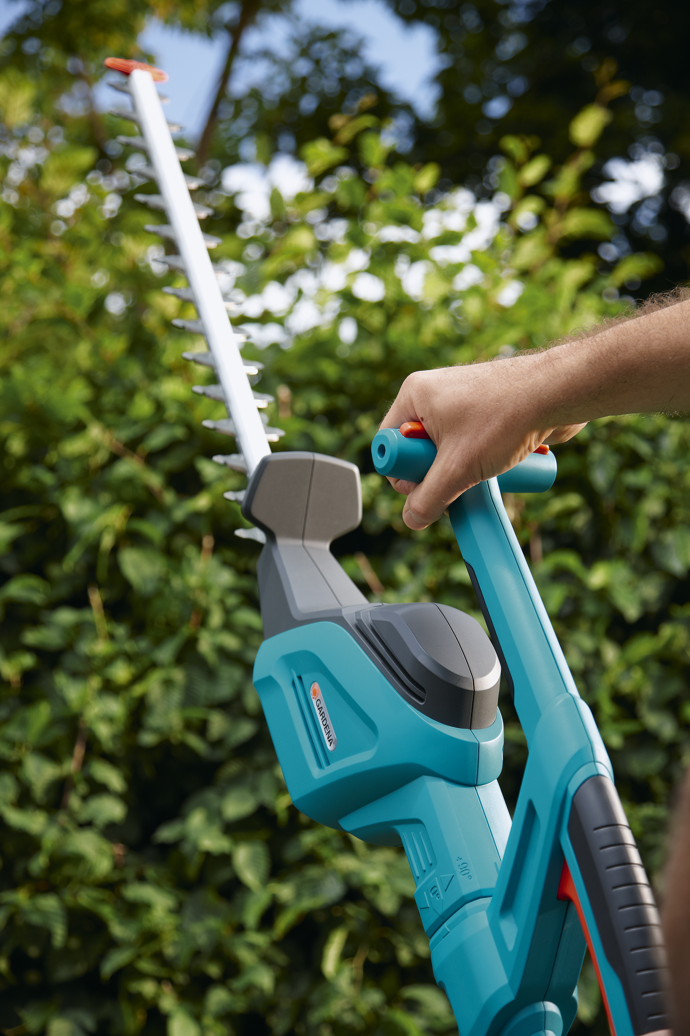 Trimmerul electric de gard viu ErgoCut 58 GARDENA este potrivit pentru o tundere uşoară şi confortabilă a gardurilor vii. Datorită lamei inovatoare - ce se poate roti cu 90° - veţi sta întotdeauna într-o poziţie ideală pentru tăiere lângă gardul viu - fără a schimba poziţia mâinilor. Datorită mânerului ergonomic, trimmerul de gard viu se potriveşte bine şi sigur în mână în orice situaţie de tăiere. Acest lucru garantează o muncă plăcută şi fără efort. Noua geometrie a lamei şi lamele cu o precizie de laser susţin elementele ce urmează a fi tăiate şi asigură o tăiere eficientă, rapidă şi curată. Alunecarea materialului de tăiere şi tăierea neplăcută a părţilor rămase de gard viu este redusă semnificativ. Datorită deschiderii mari a lamei, chiar şi crengile mai groase ale gardului viu nu reprezintă o problemă. Pentru o tăiere puternică şi continuă dintr-o singură mişcare - fără blocaje şi întreruperi neplăcute - trimmerul electric de gard viu este dotat cu un motor puternic şi de mare performanţă. Siguranţa dvs. este importantă pentru GARDENA. Apărătoarea de la capătul lamei protejează utilizatorul împotriva reculului la tăierea în apropierea solului şi protejează lama împotriva avarierii. Un dispozitiv de detensionare a cablului împiedică desprinderea accidentală a cablului prelungitor.