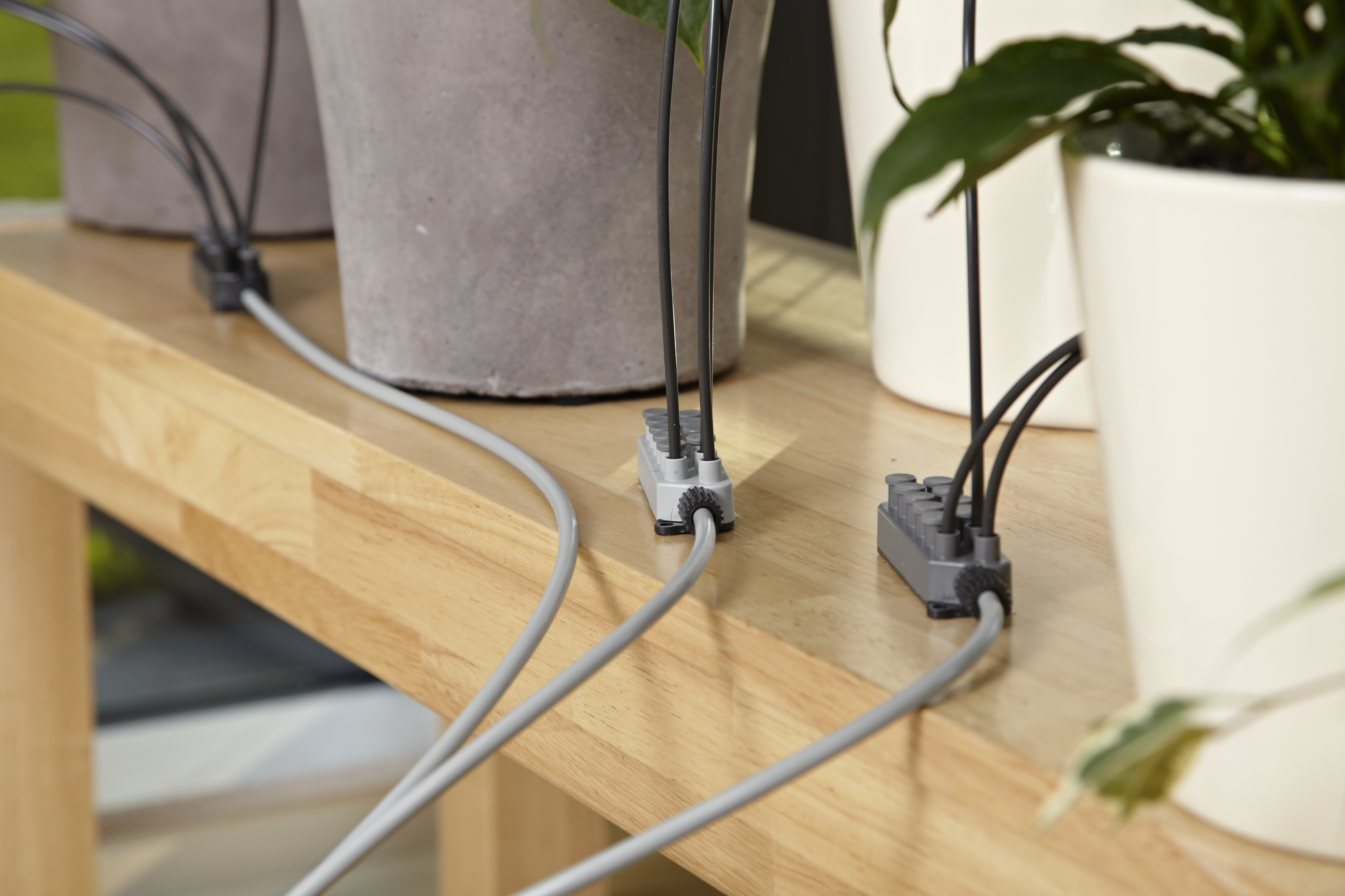 Cu Setul de udat pe durata concediului GARDENA, până la 36 de plante pot fi udate automat. În acest fel, vă puteți aproviziona cu ușurință plantele fără o cană de udare - și veți avea un înlocuitor ideal în absența dumneavoastră. Peste trei distribuitori diferiți, fiecare cu 12 ieșiri, pot fi atribuite diverse cerințe de alimentare cu apă pentru anumite instalații. Transformatorul complet închis de joasă tensiune poate fi utilizat atât în interior, cât și în exterior