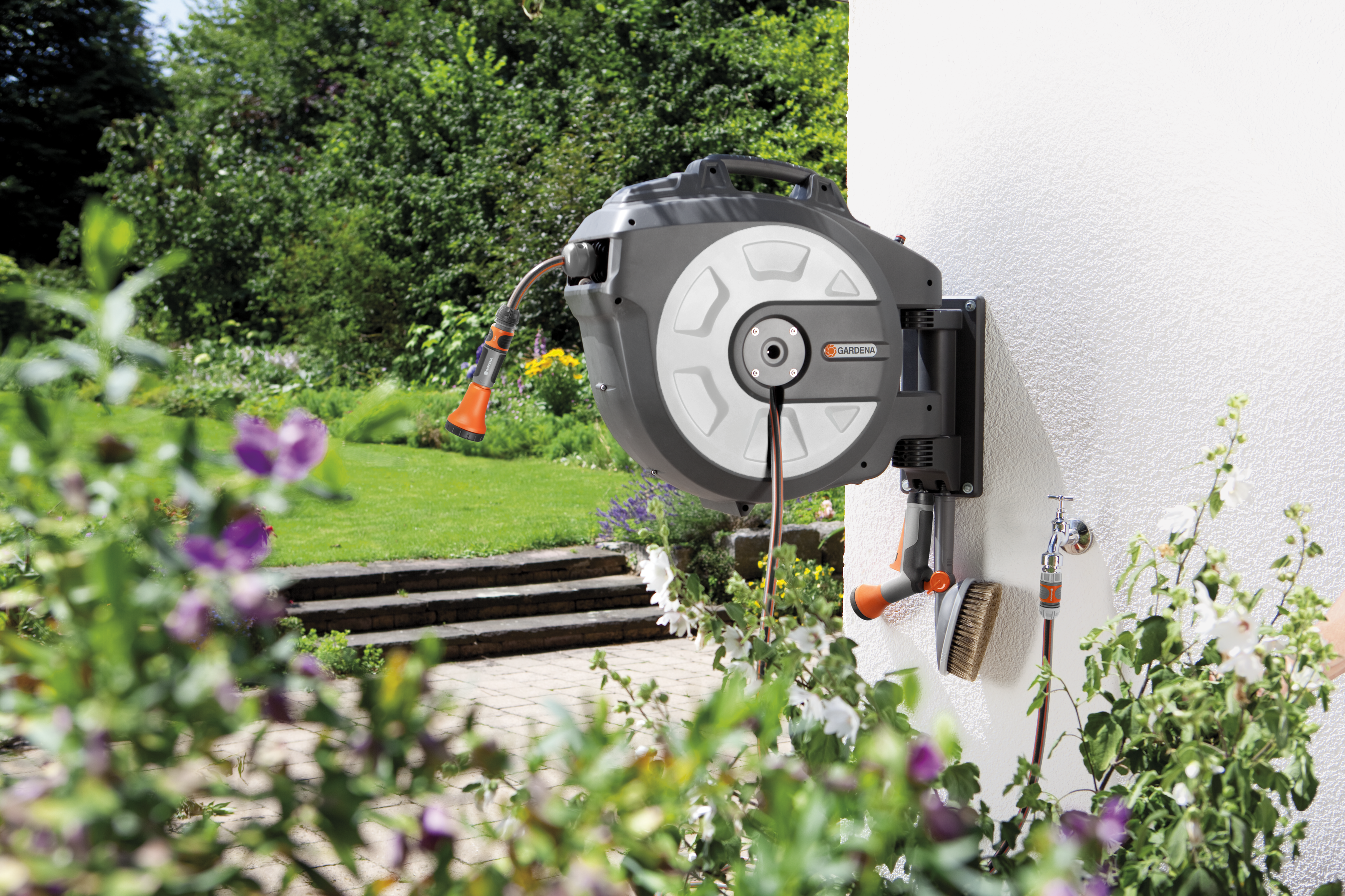 Dispozitiv de perete pentru furtun Comfort GARDENA 35 roll-up automatic pentru grădini de dimensiune medie. Trageți furtunul la lungimea dorită. Rularea automată a furtunului este activată de o tragere – smucire scurtă a furtunului. Furtunul se rulează singur, sigur și uniform. Cu 35 m furtun de calitate GARDENA 13 mm (1/2″) pentru debite mari de apă. Poate fi rotit la 180° pe perete. Suport practic pentru depozitarea pistoalelor de stropit, periilor și altor accesorii de udare GARDENA. Pregătit pentru protecție anti-furt. Mâner integrat pentru simplificarea transportului și depozitării.