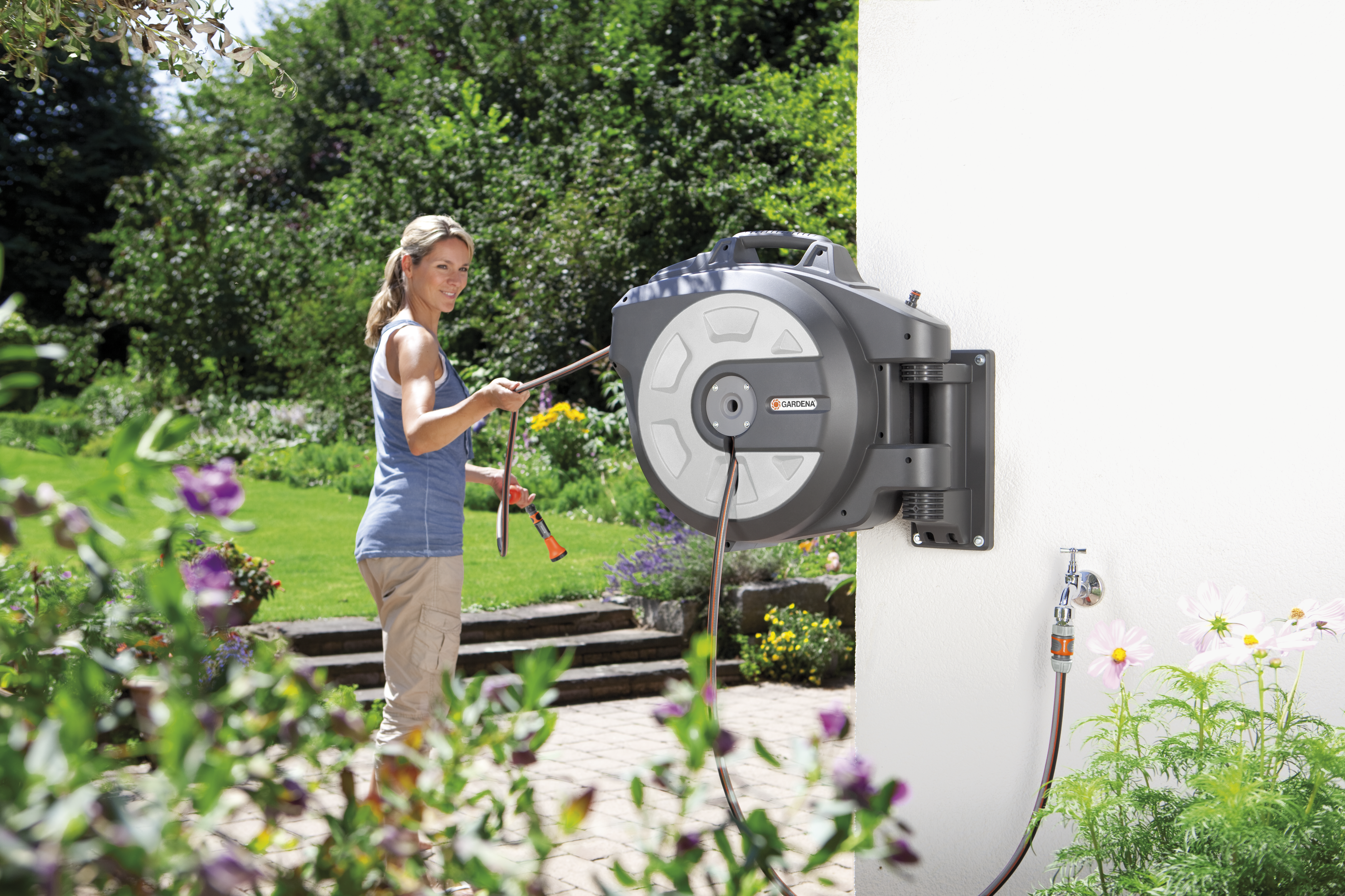 Dispozitivul anti-picurare previne scurgerea apei după utilizare. Udarea poate fi atât de ușoară - cu Dispozitivul de perete pentru furtun Comfort GARDENA 35 roll-up automatic.