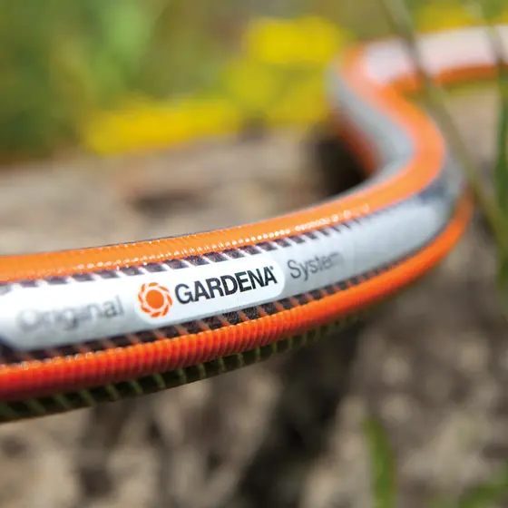 Vattentät anslutning mellan slang och Original GARDENA Systemdelar.